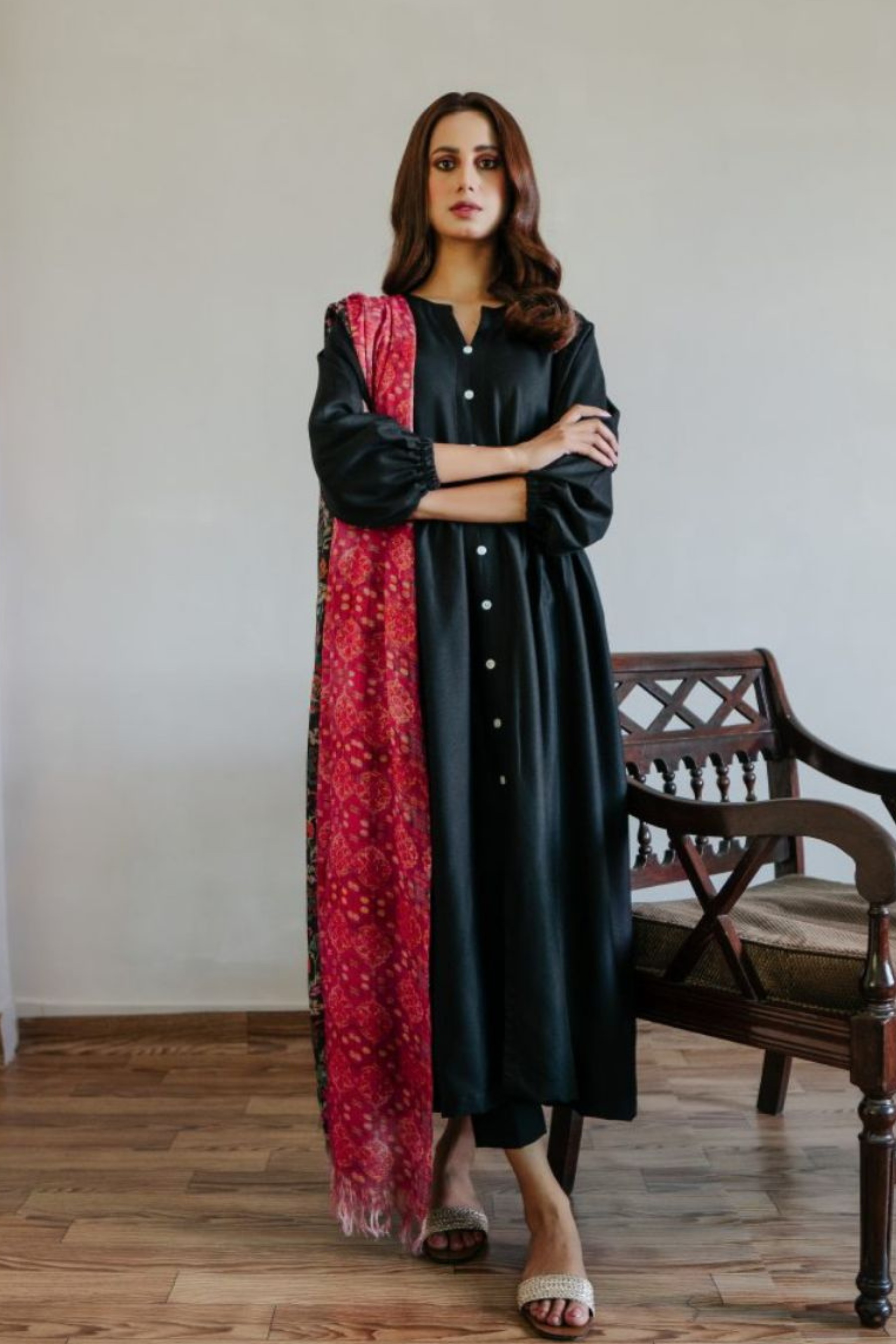 Marina frock paired with a straight-fit trouser and a printed dupatta.