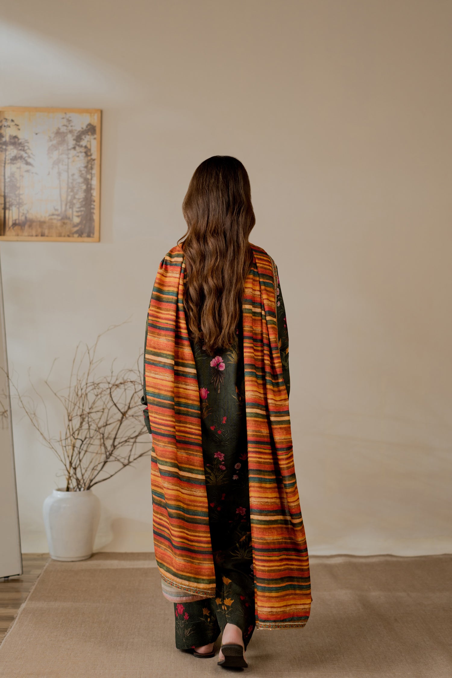 Printed karandi shawl in warm autumn shades.