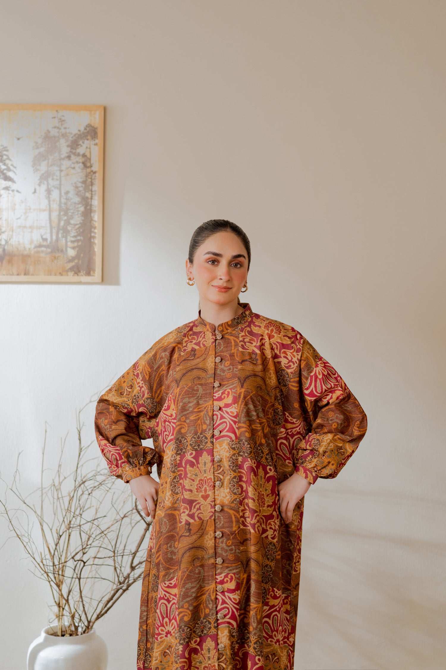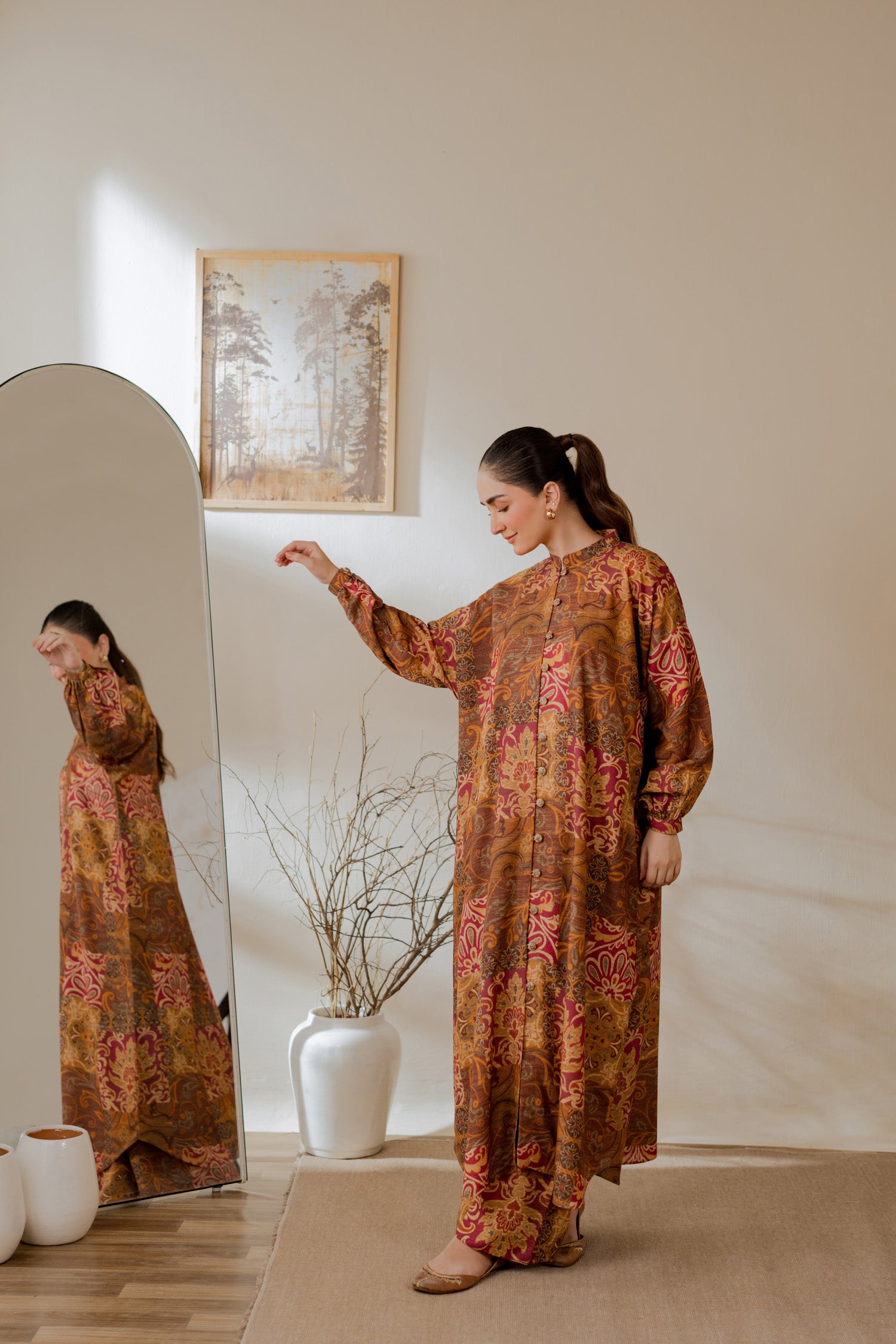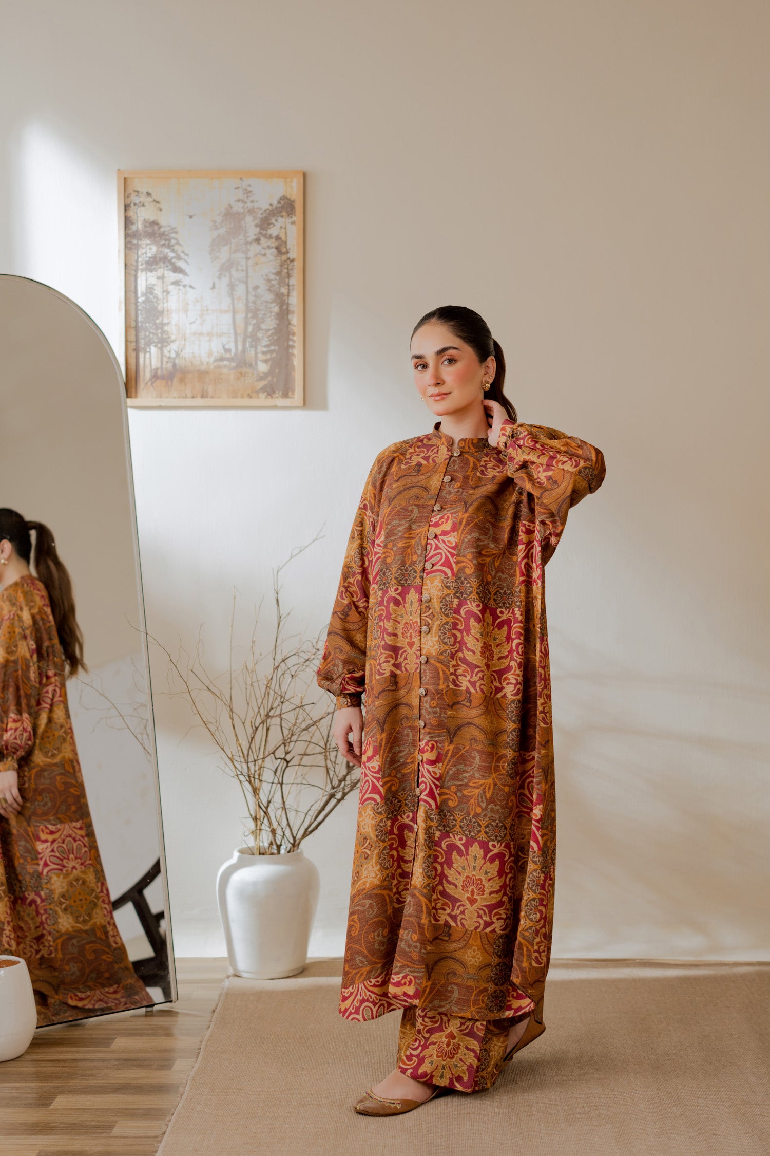Karandi printed two-piece suit in earthy brown and maroon tones.