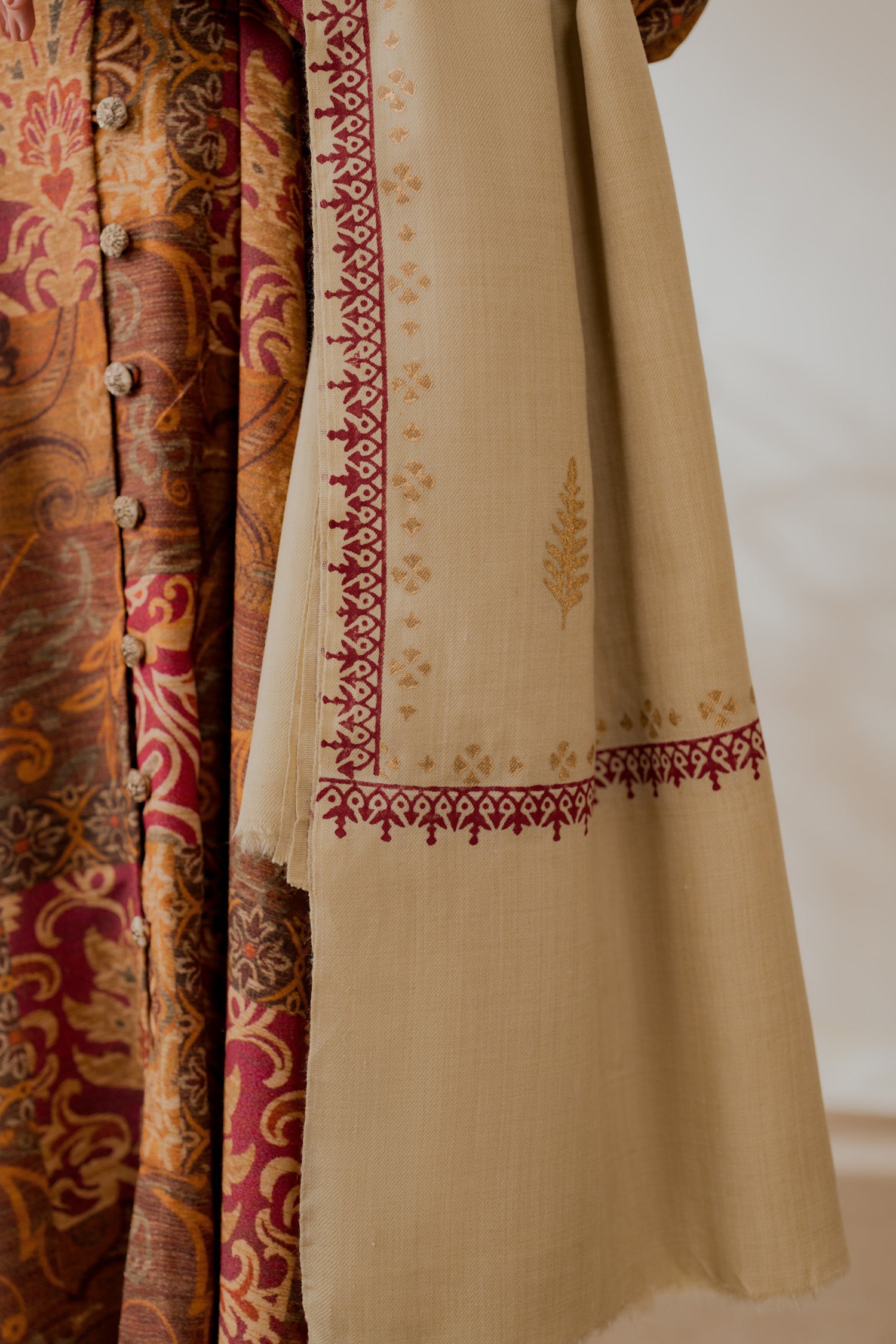 Acrylic Pashmina hand block-printed shawl in beige with delicate border detailing.