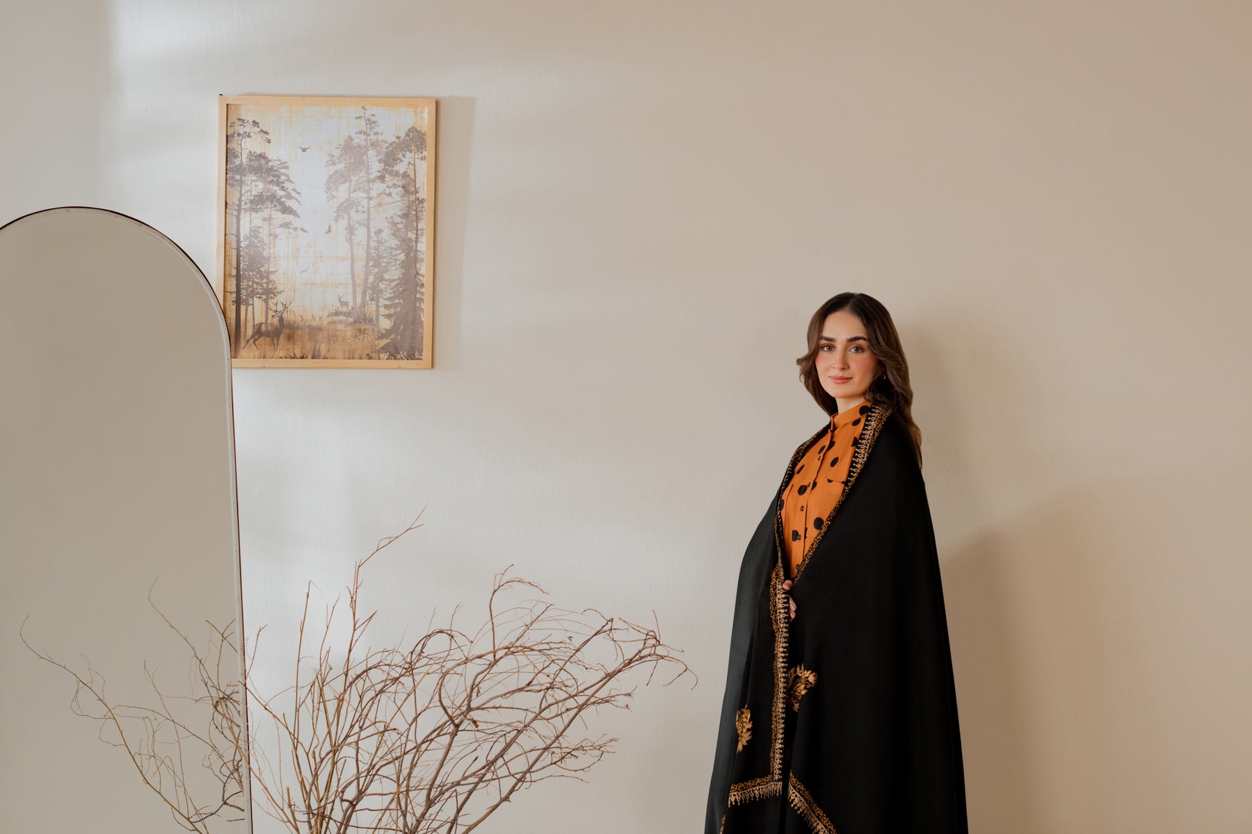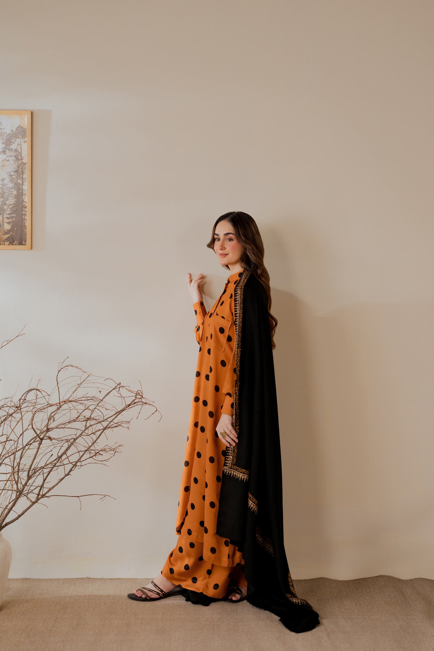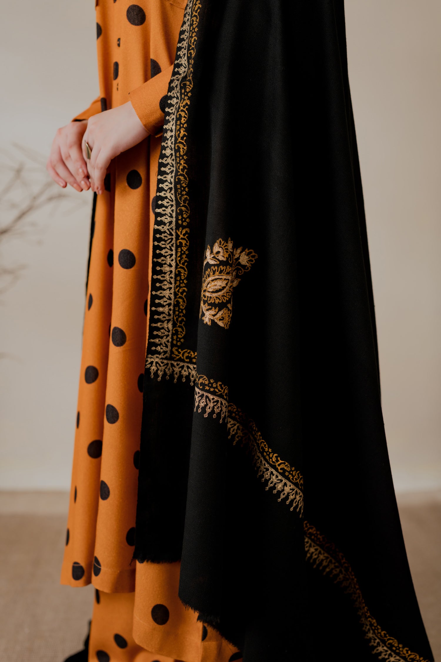 Acrylic pashmina hand block-printed shawl with gold block-print detailing.