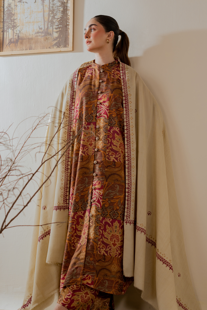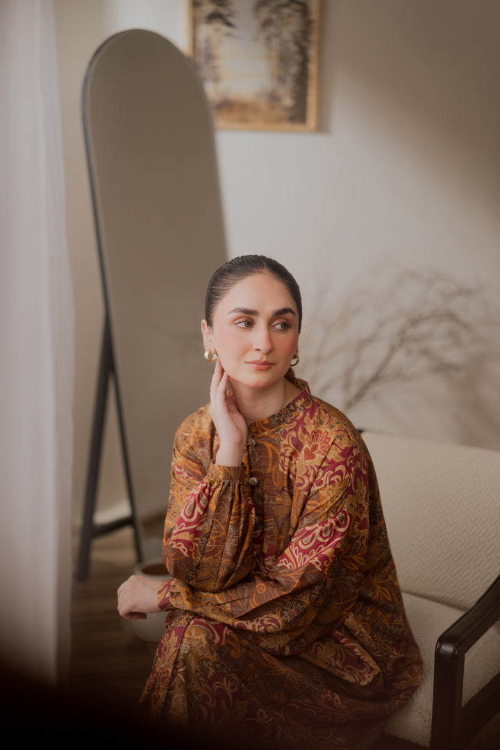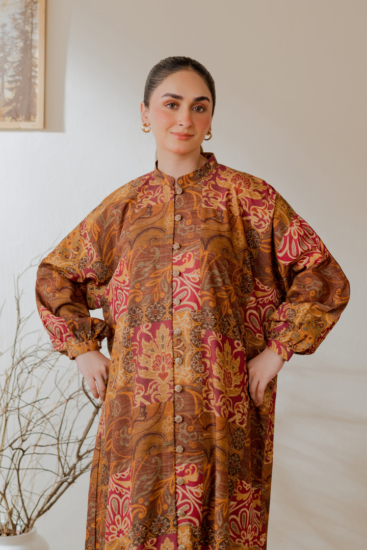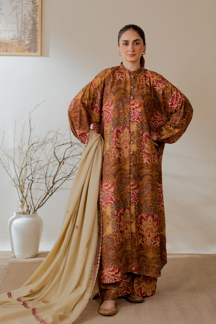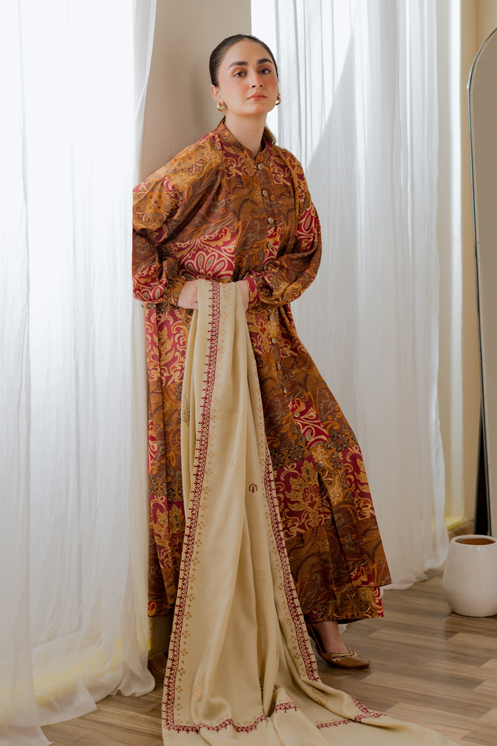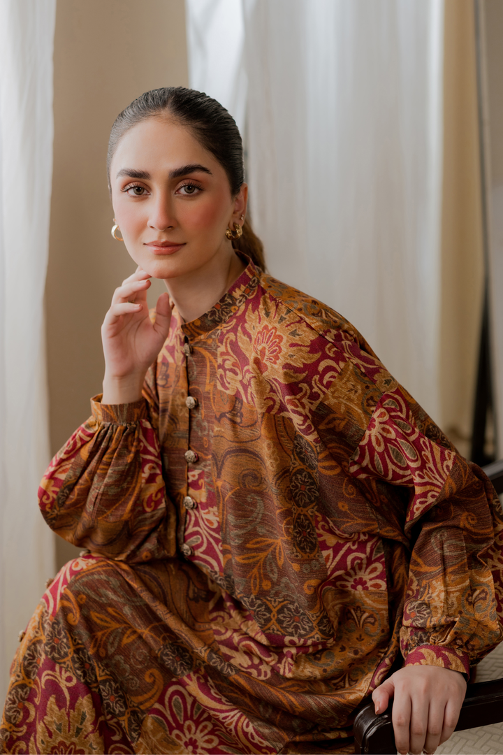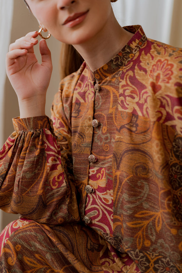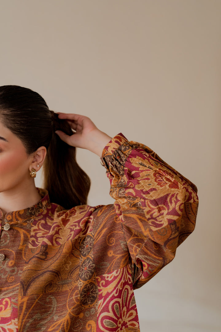 Karandi printed two-piece suit in earthy brown and maroon tones.