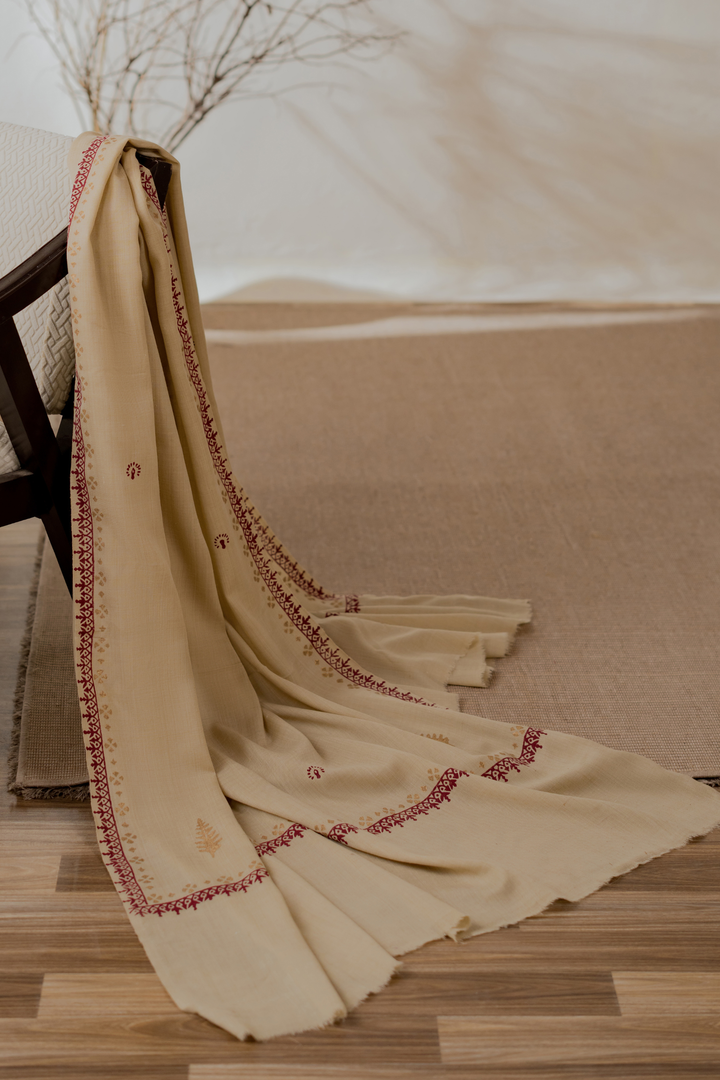 Acrylic Pashmina hand block-printed shawl in beige with border detailing.