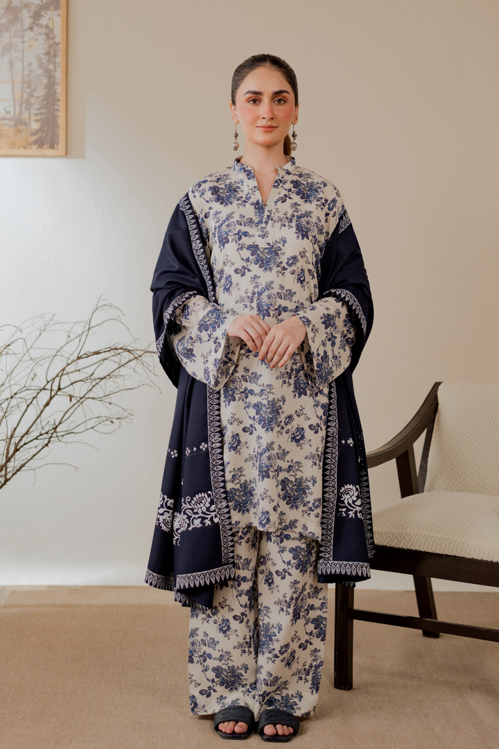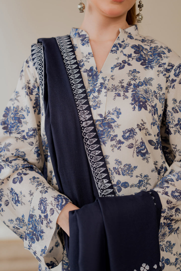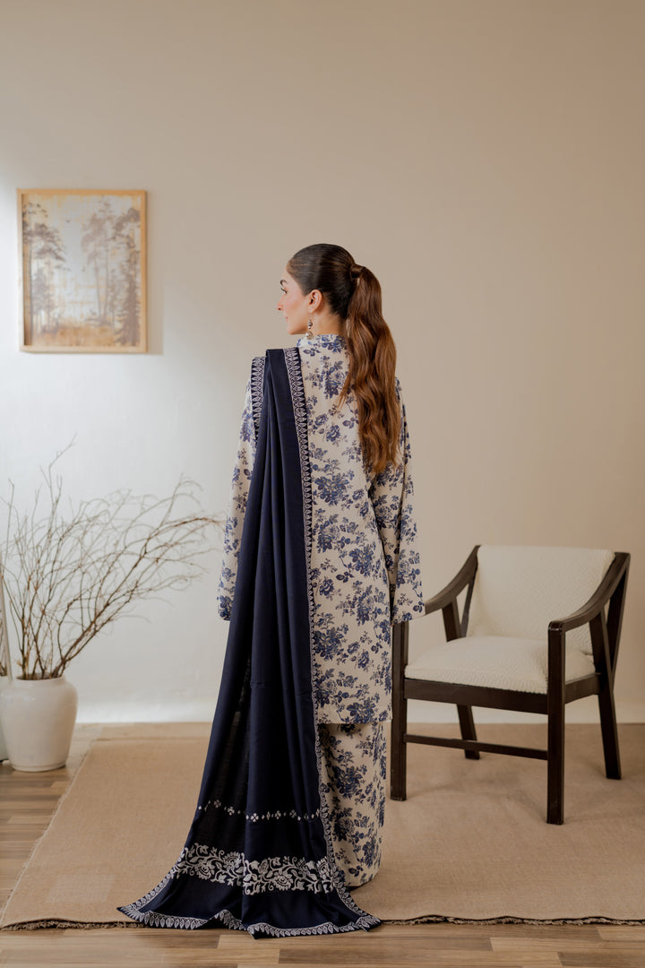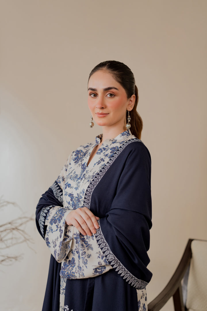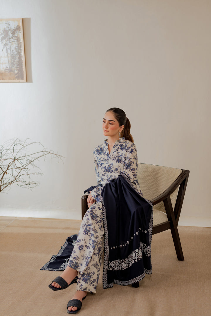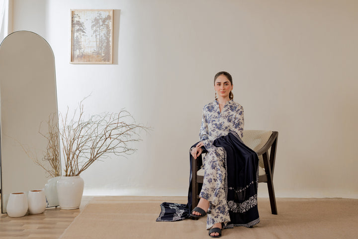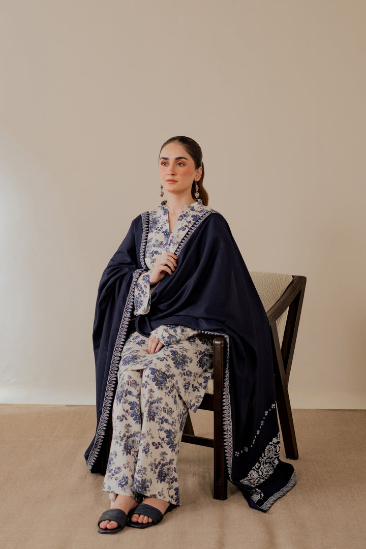 Hand block printed marina shawl in deep navy with white motifs and borders.