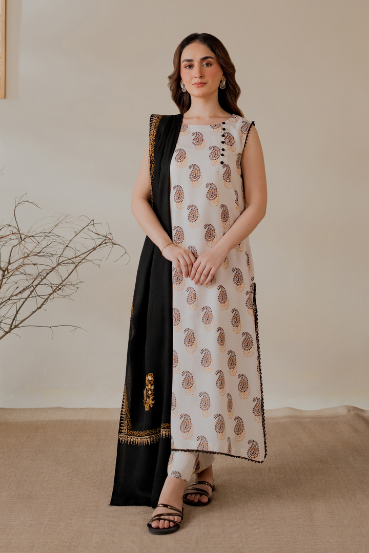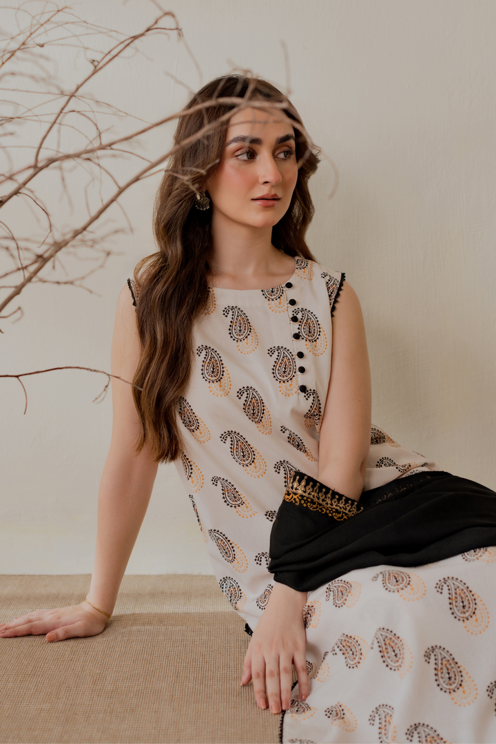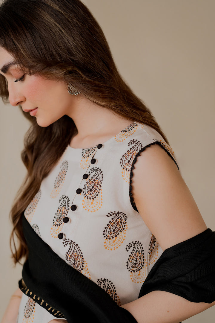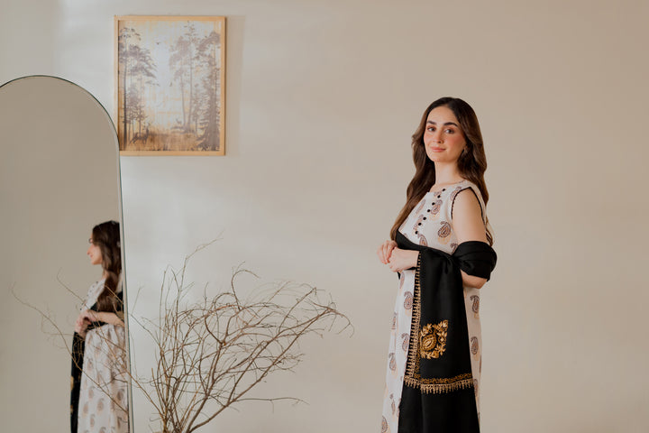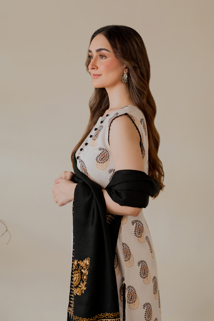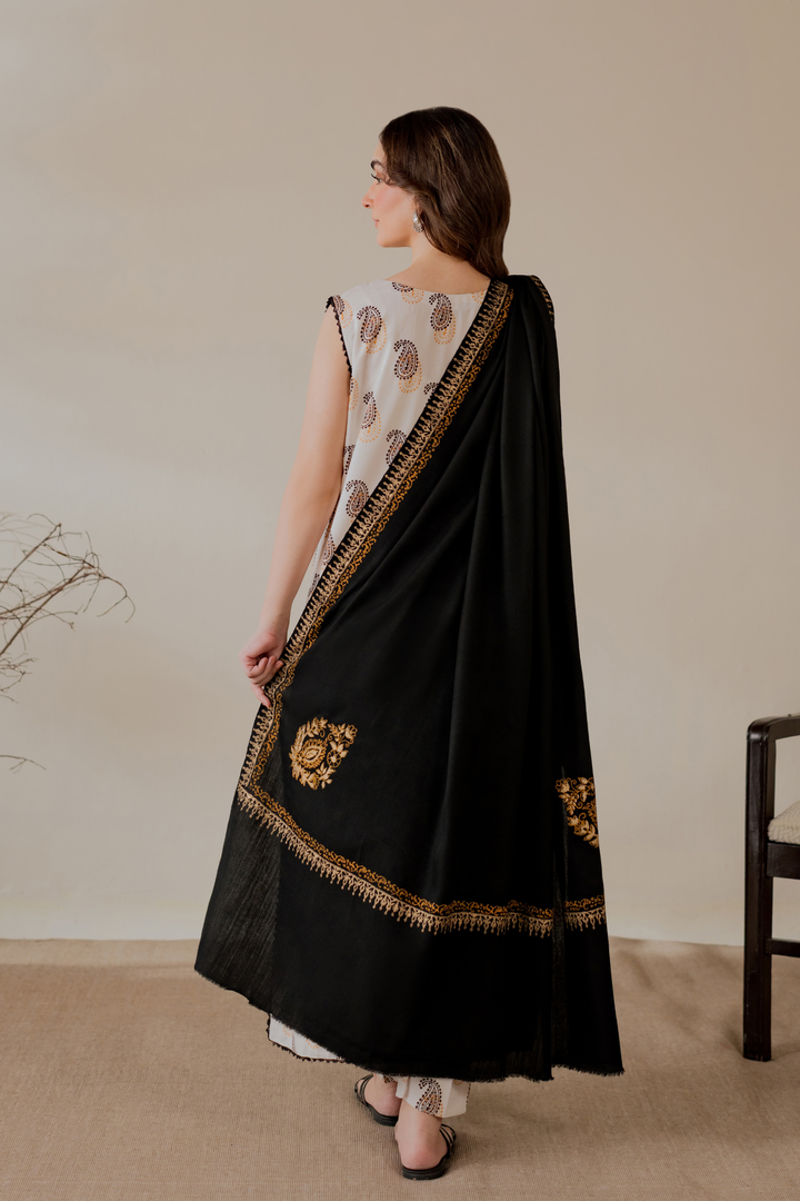 Hand block-printed acrylic pashmina shawl with golden accents.