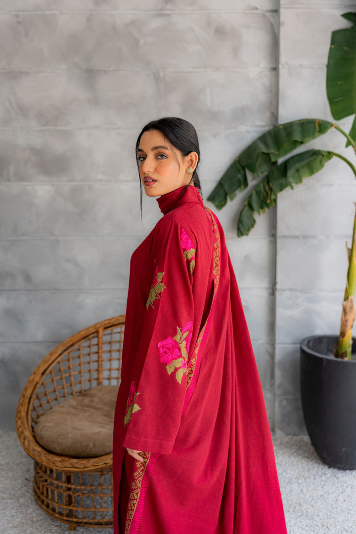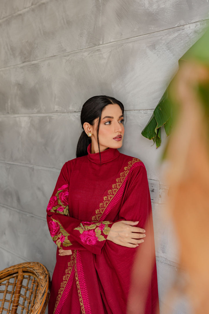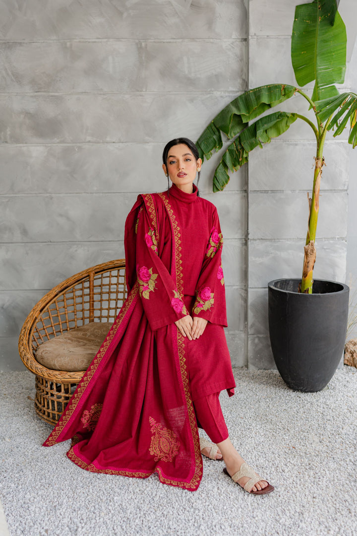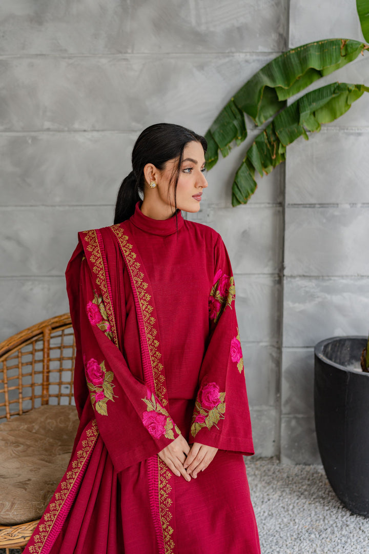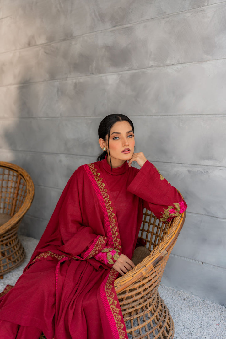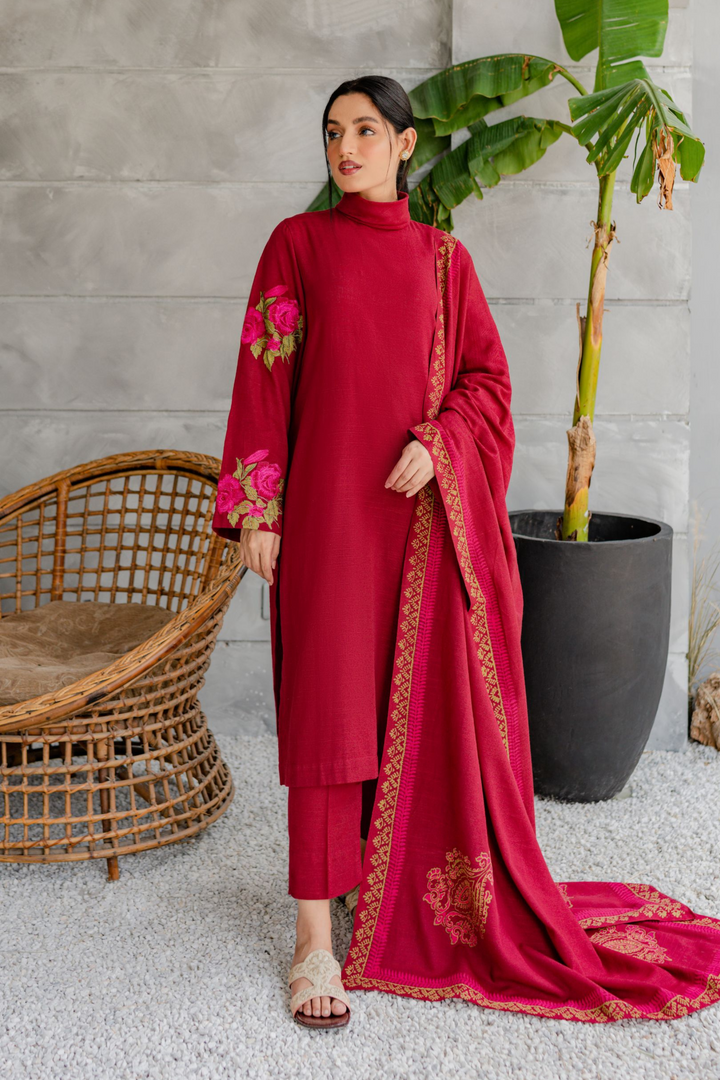 Khaddar embroidered shirt, matching straight-fit trouser; hand block-printed khaddar shawl.