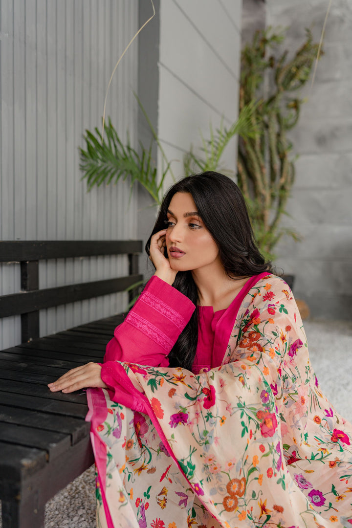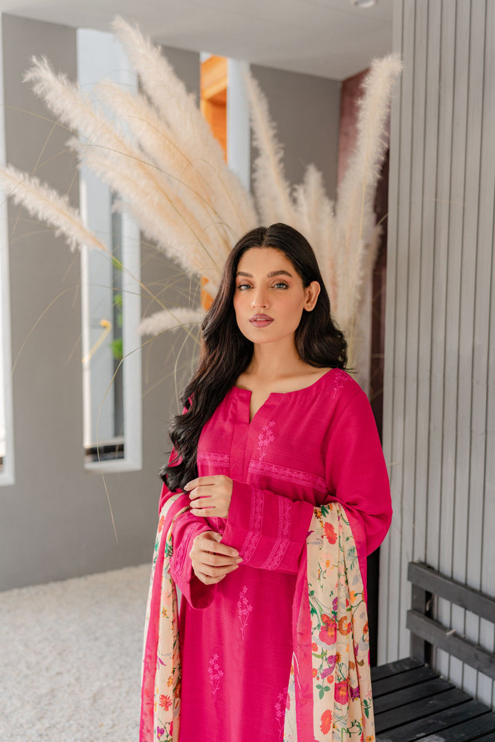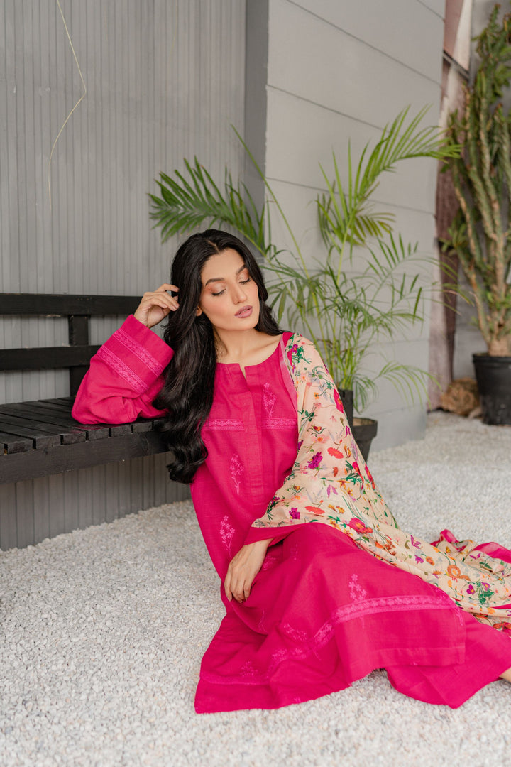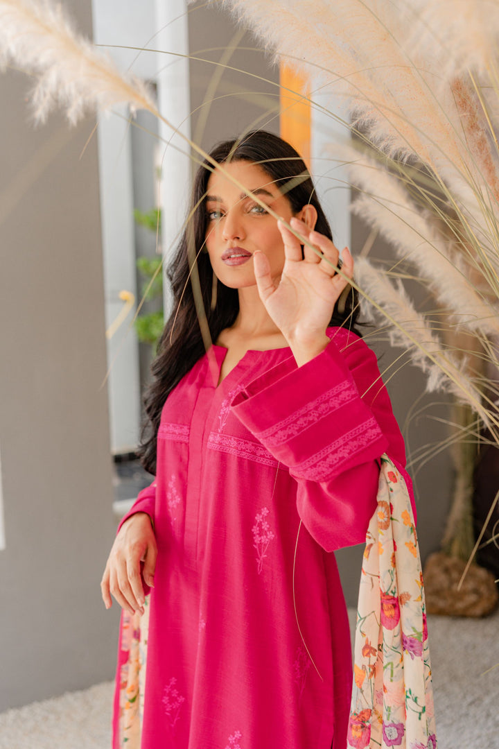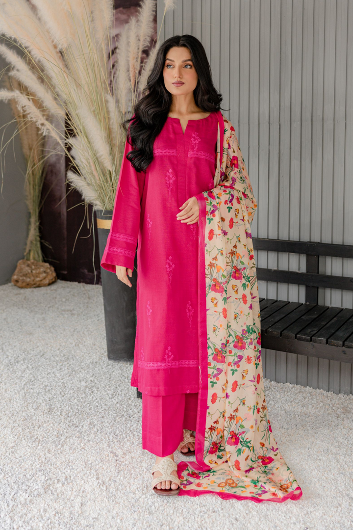Embroidered slub-khaddar shirt, matching loose-fit trouser, printed dupatta.