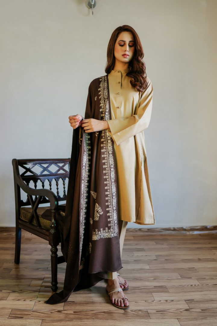 Kalidaar khaddar kurta with a band collar, matching straight fit trouser & hand block-printed chaadar.