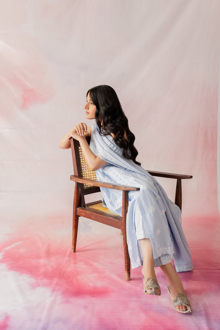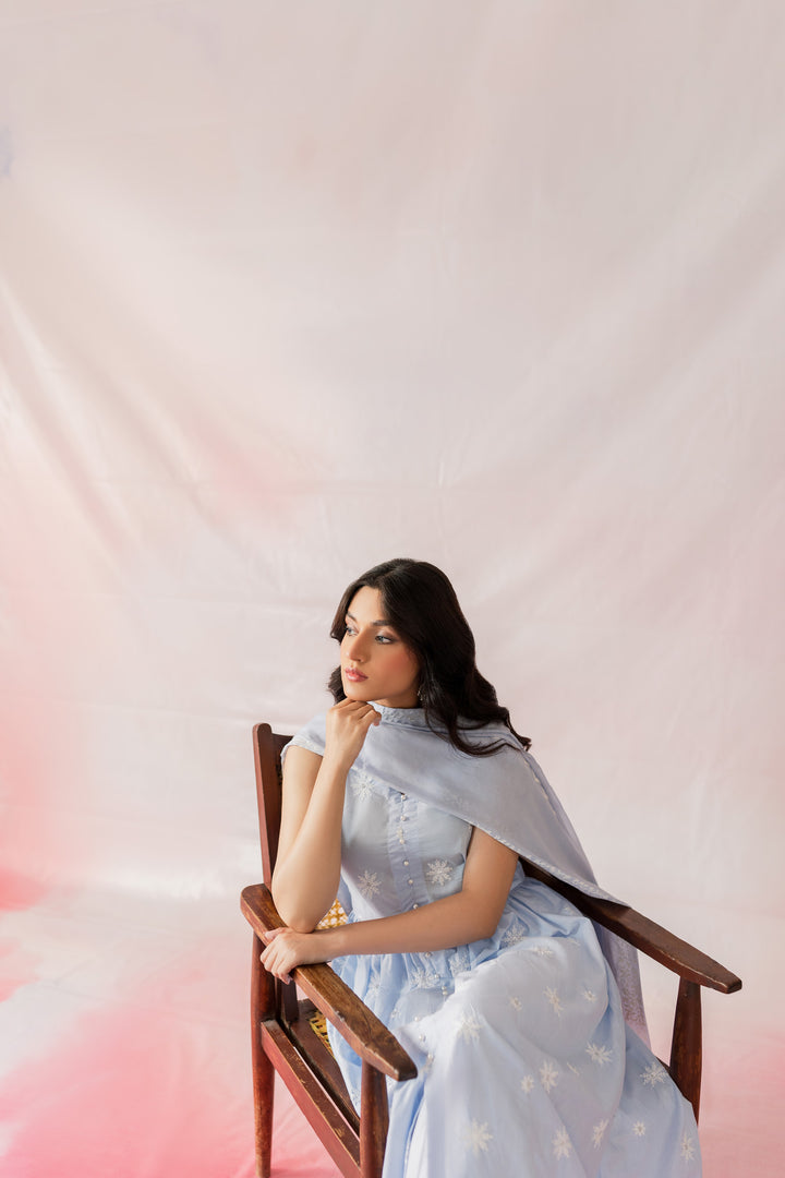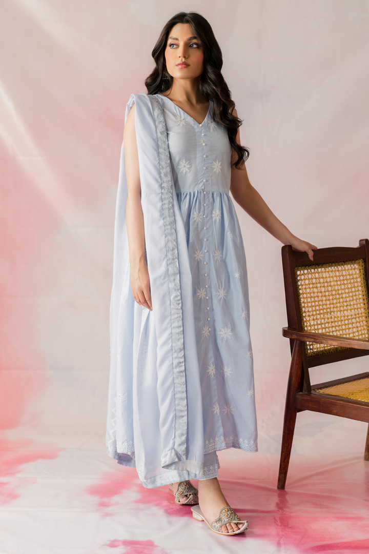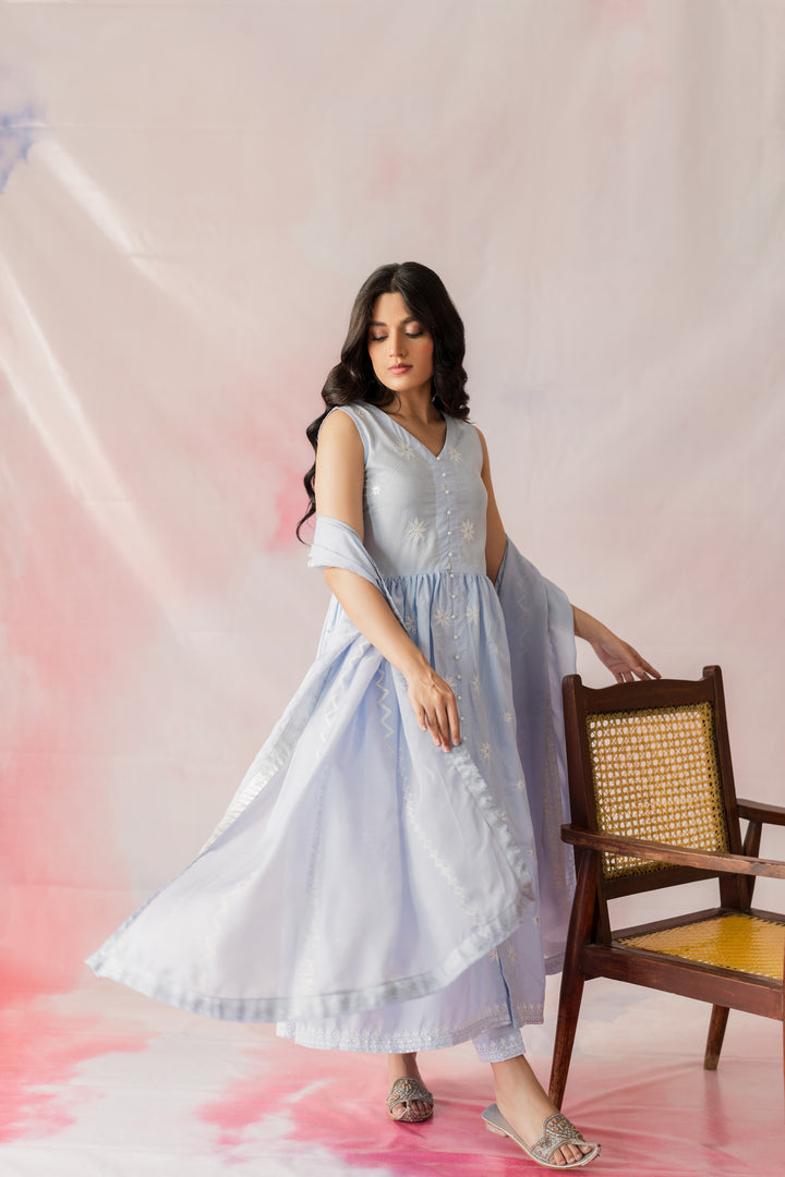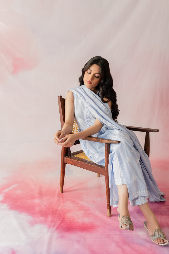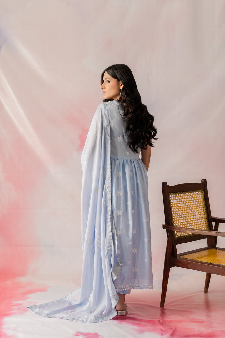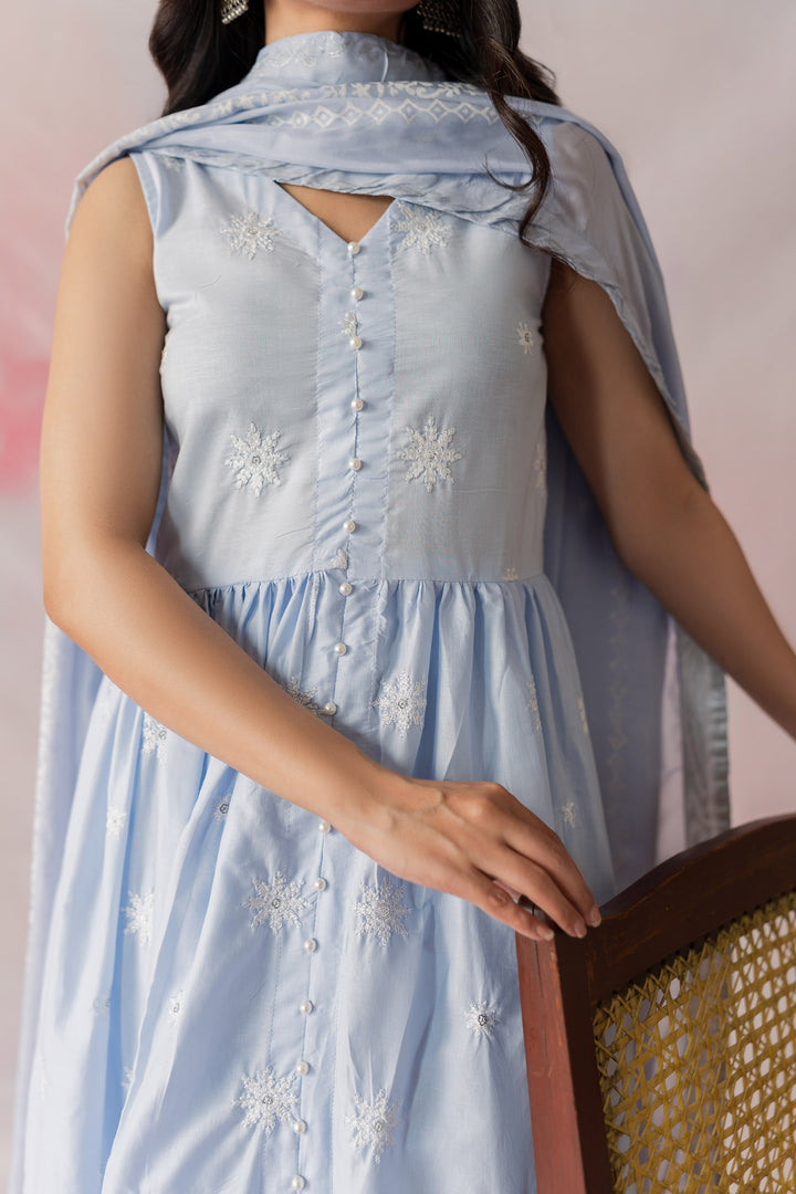 Lawn-cotton sequin and thread embroidered frock with straight-fit trousers.