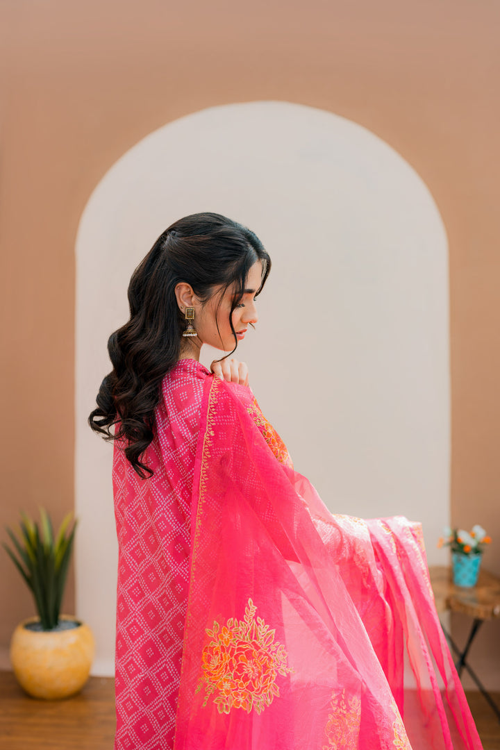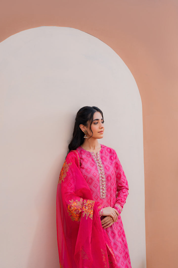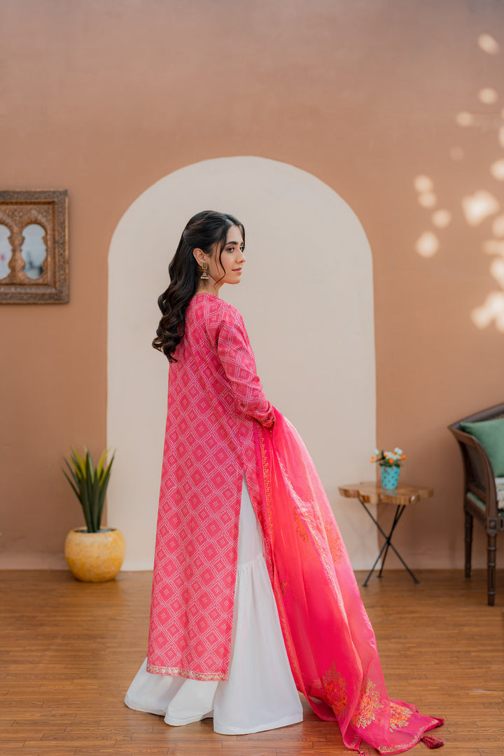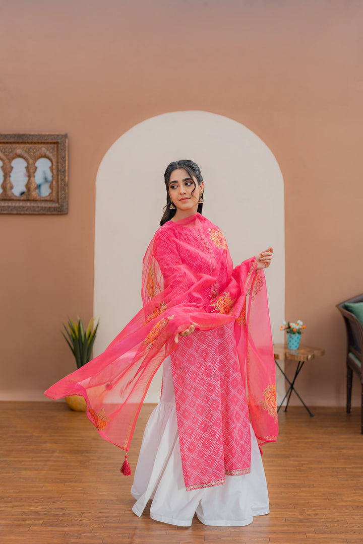 Printed shirt with embroidered details, paired with a wide flare gharara and a hand block-printed chiffon dupatta.