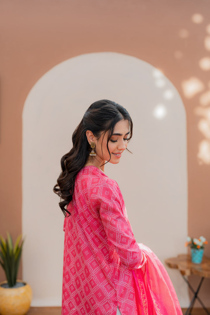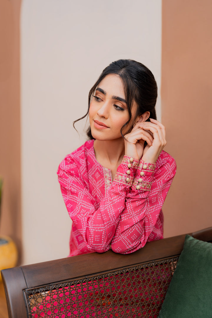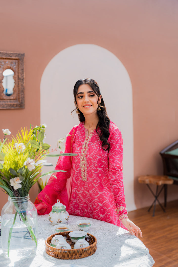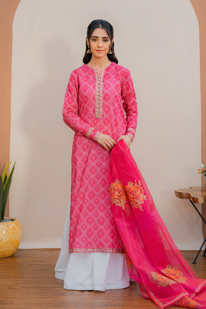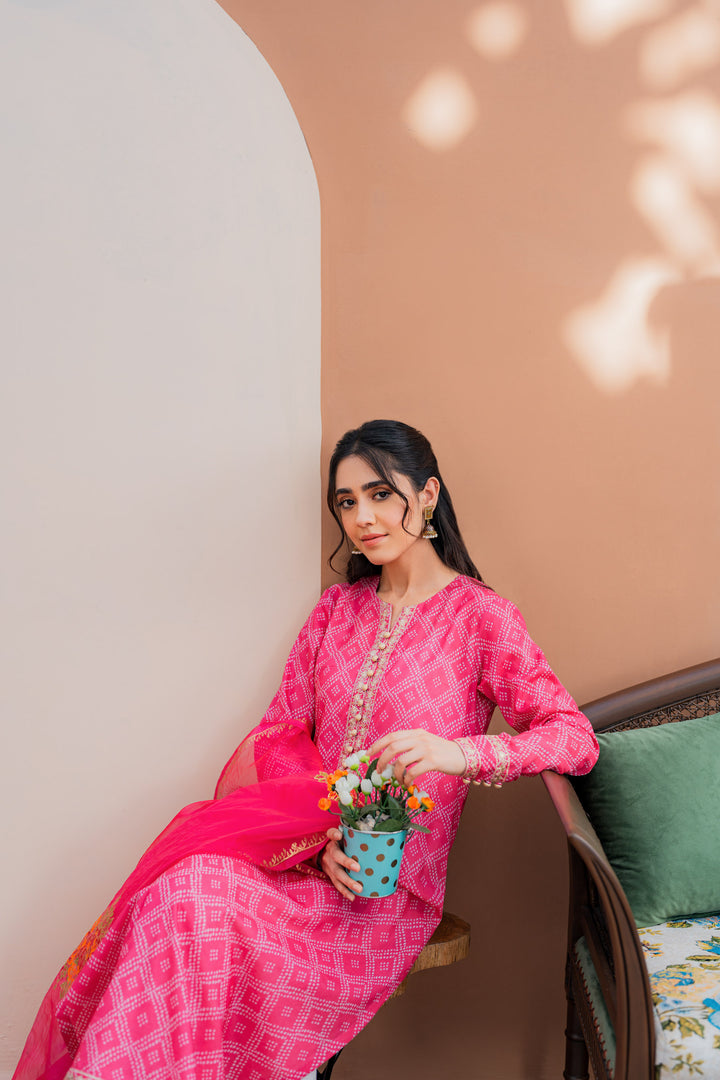 Printed shirt with embroidered details, paired with a wide flare gharara and a hand block-printed chiffon dupatta.