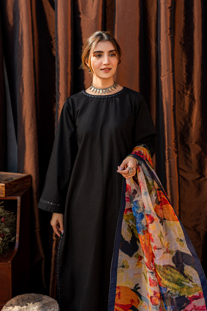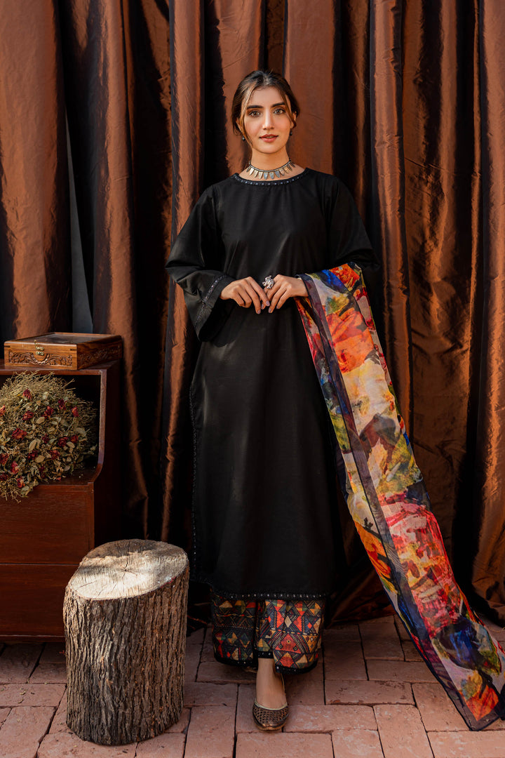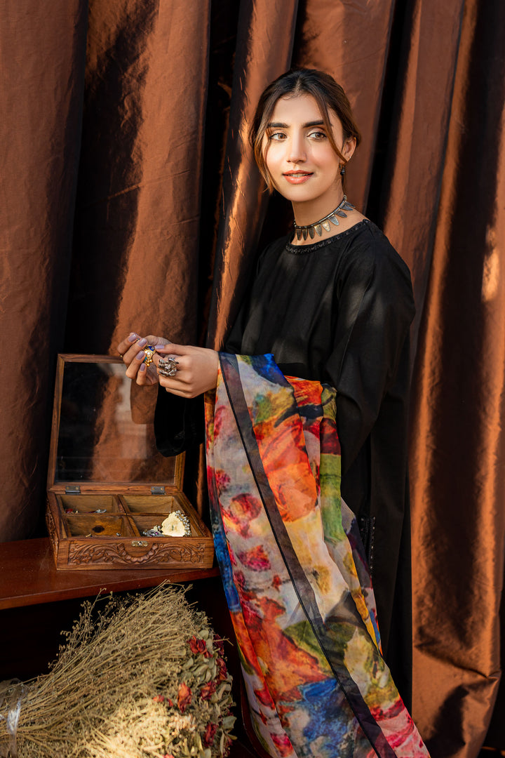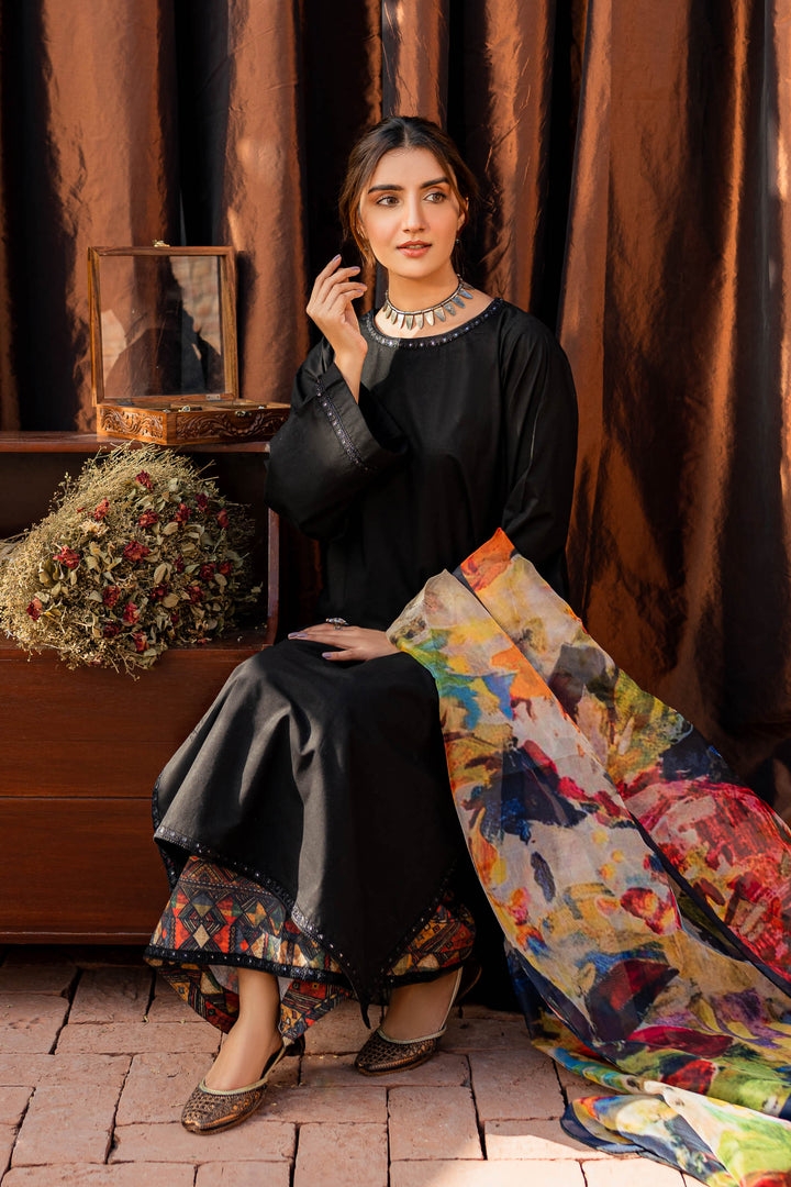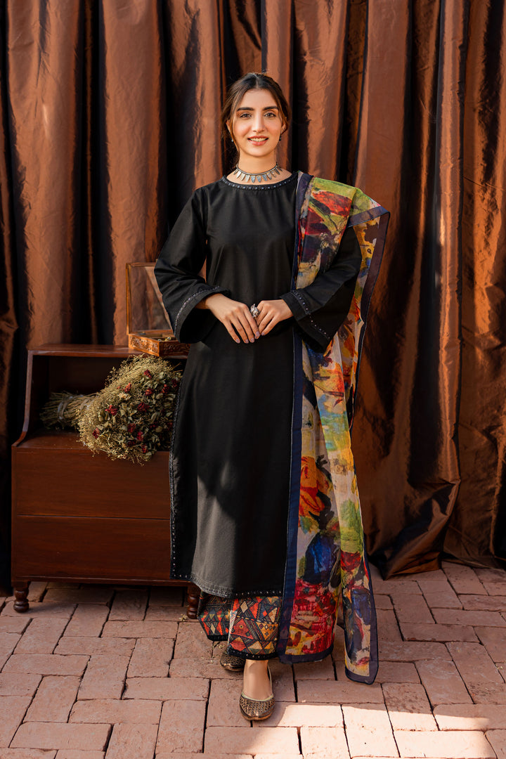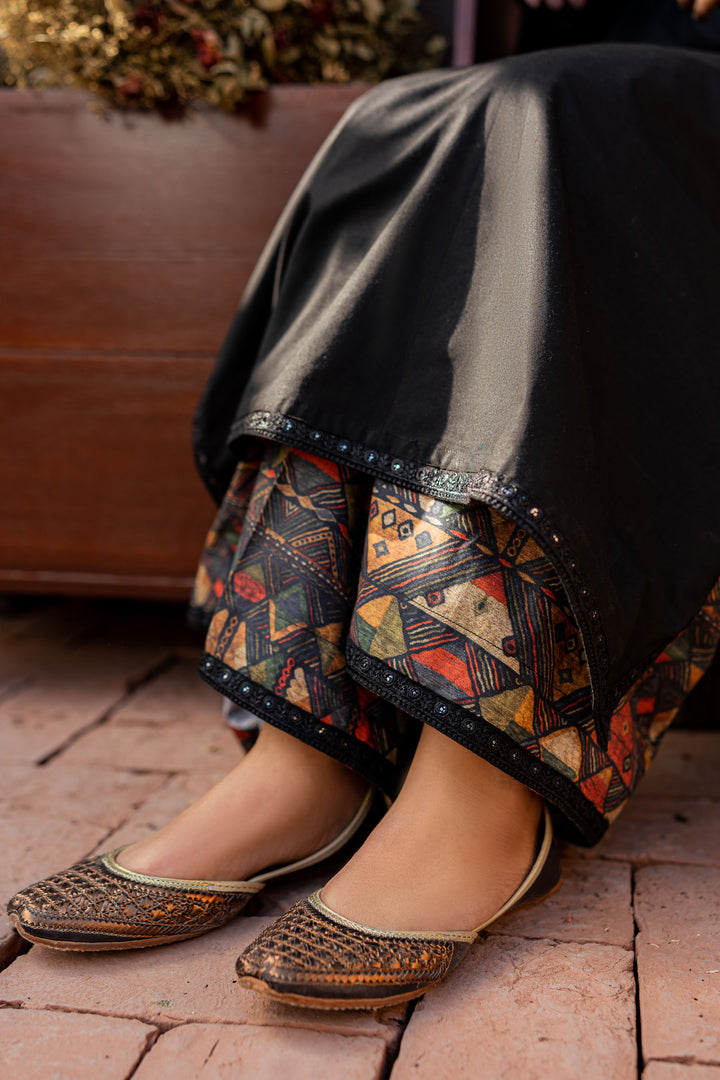 Two piece suit: Embroidered lawn-cotton shirt paired with printed lawn-cotton trousers.