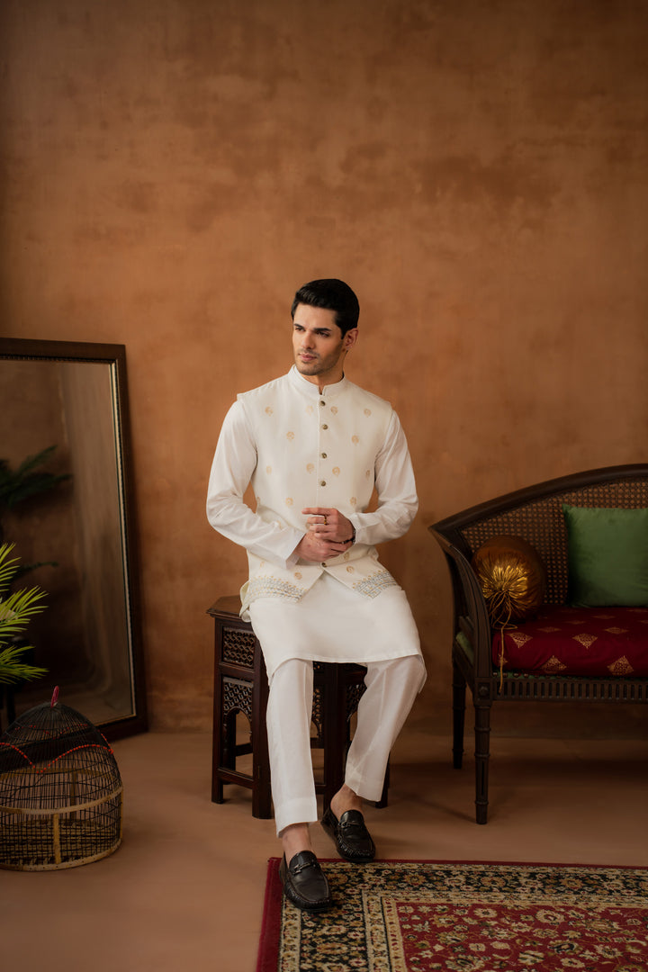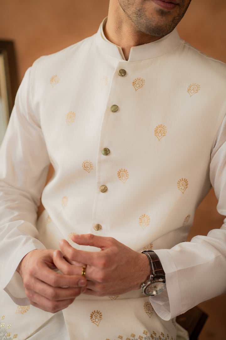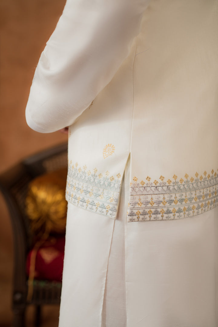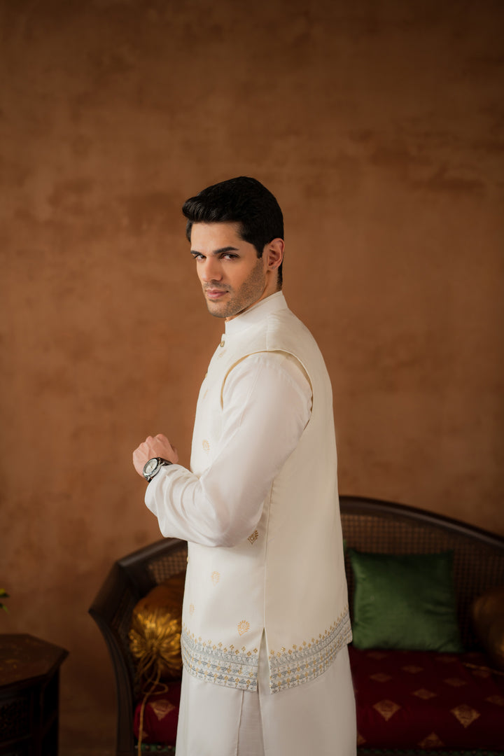 Waistcoat: Embroidered and hand-block printed Raw Silk.