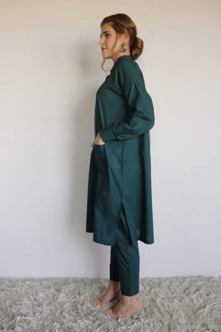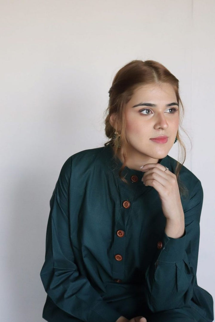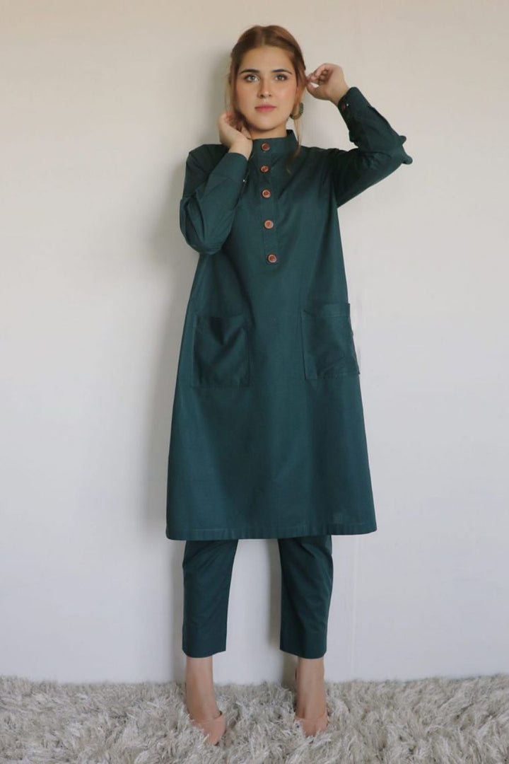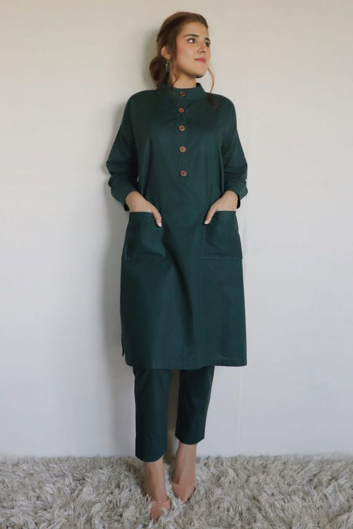 Khaddar kurta with button details and cuffed sleeves; paired with a straight pant.