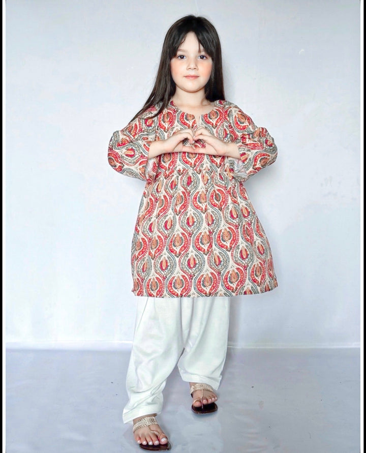 Girls: Printed karandi shirt with a plain shalwar