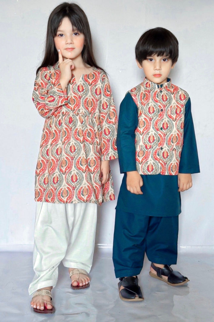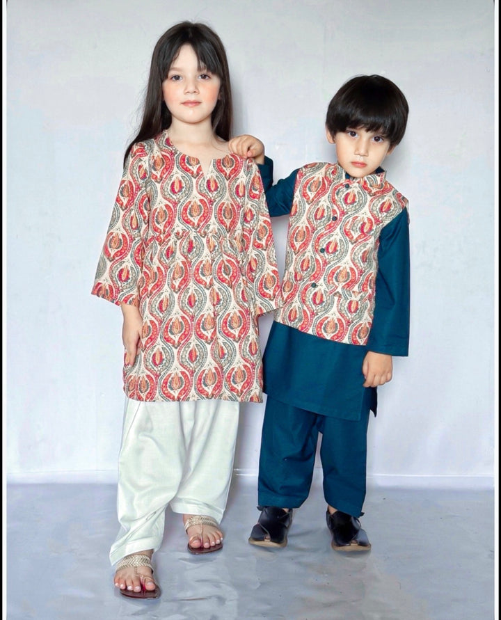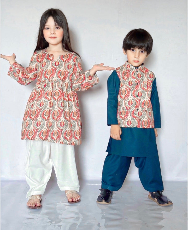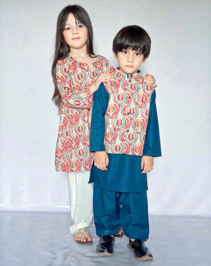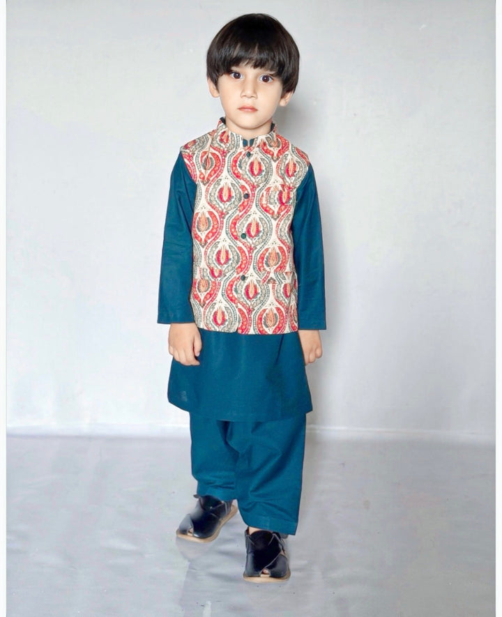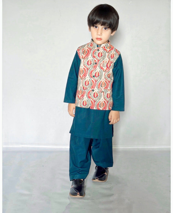 Boys: Marina kurta shalwar with a printed karandi waistcoat