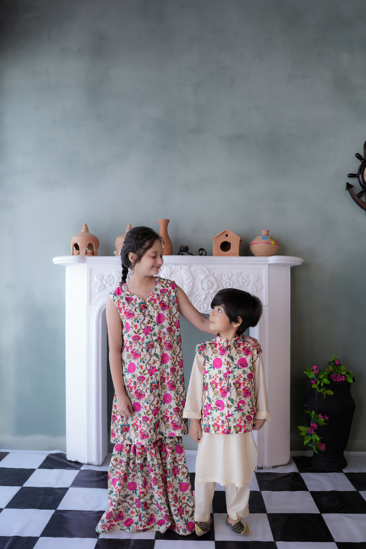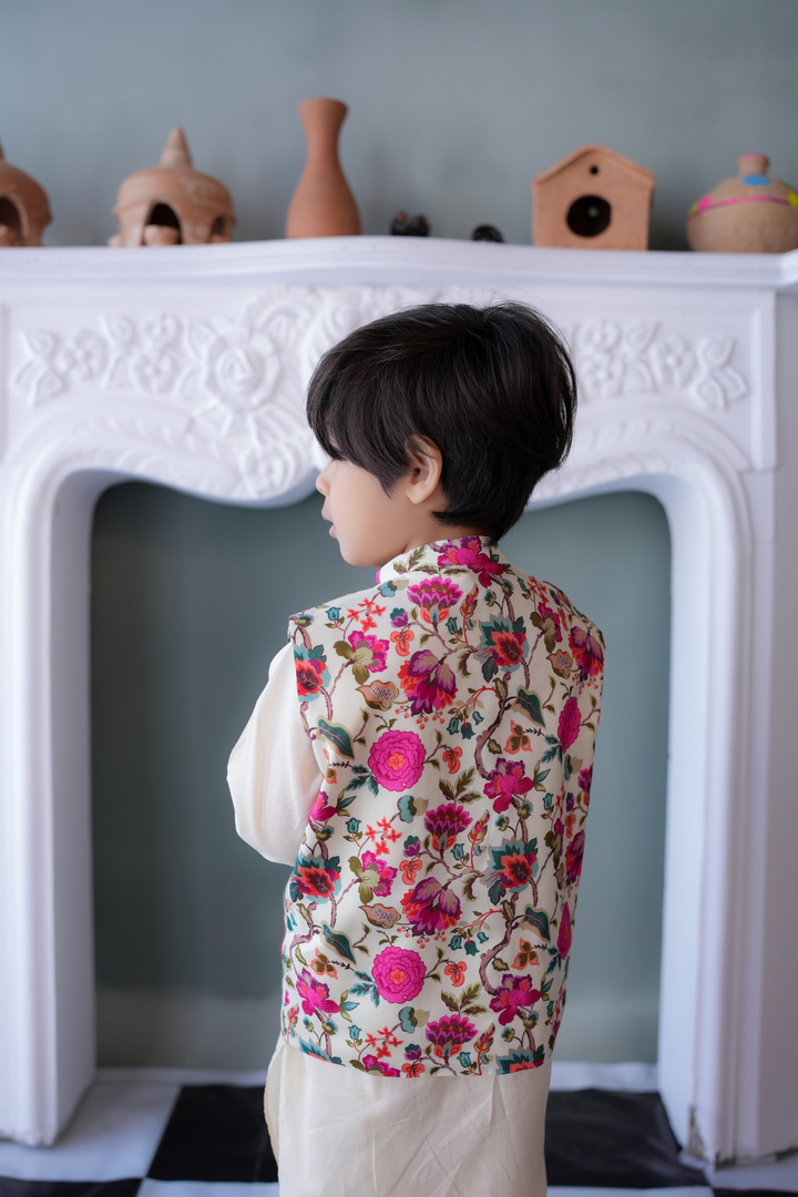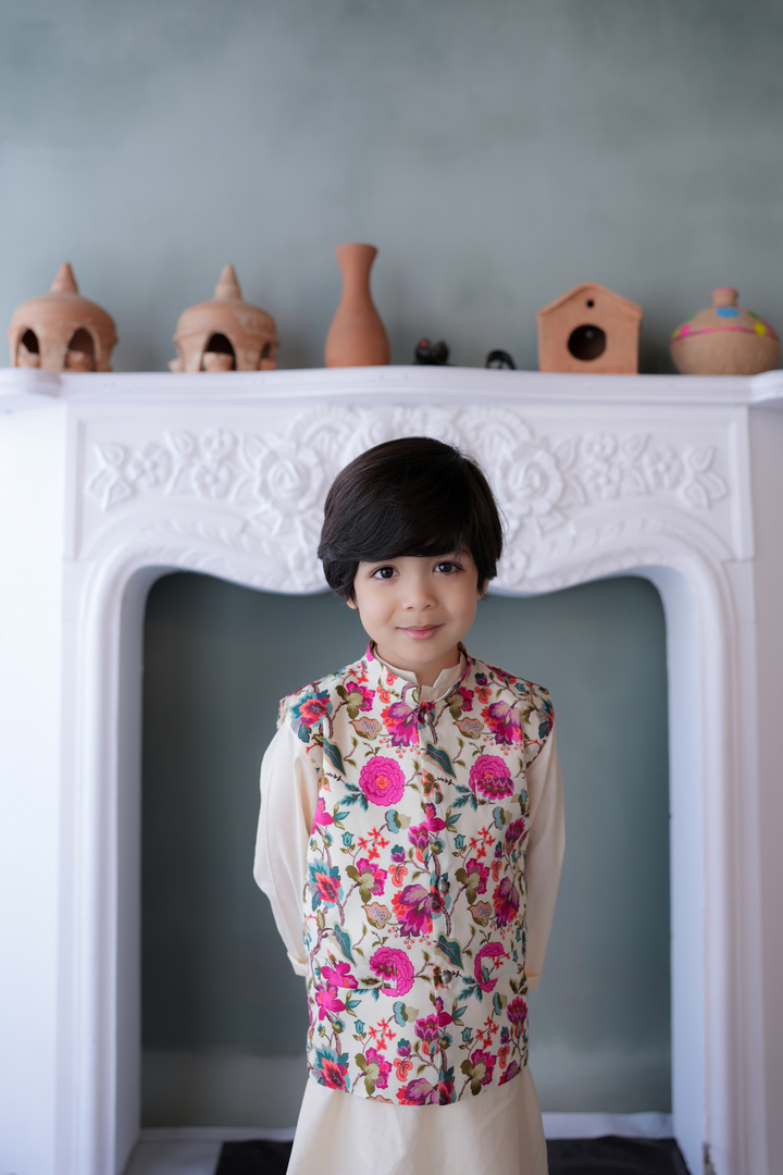 Three piece set - Cream kurta and shalwar paired with a printed waistcoat.