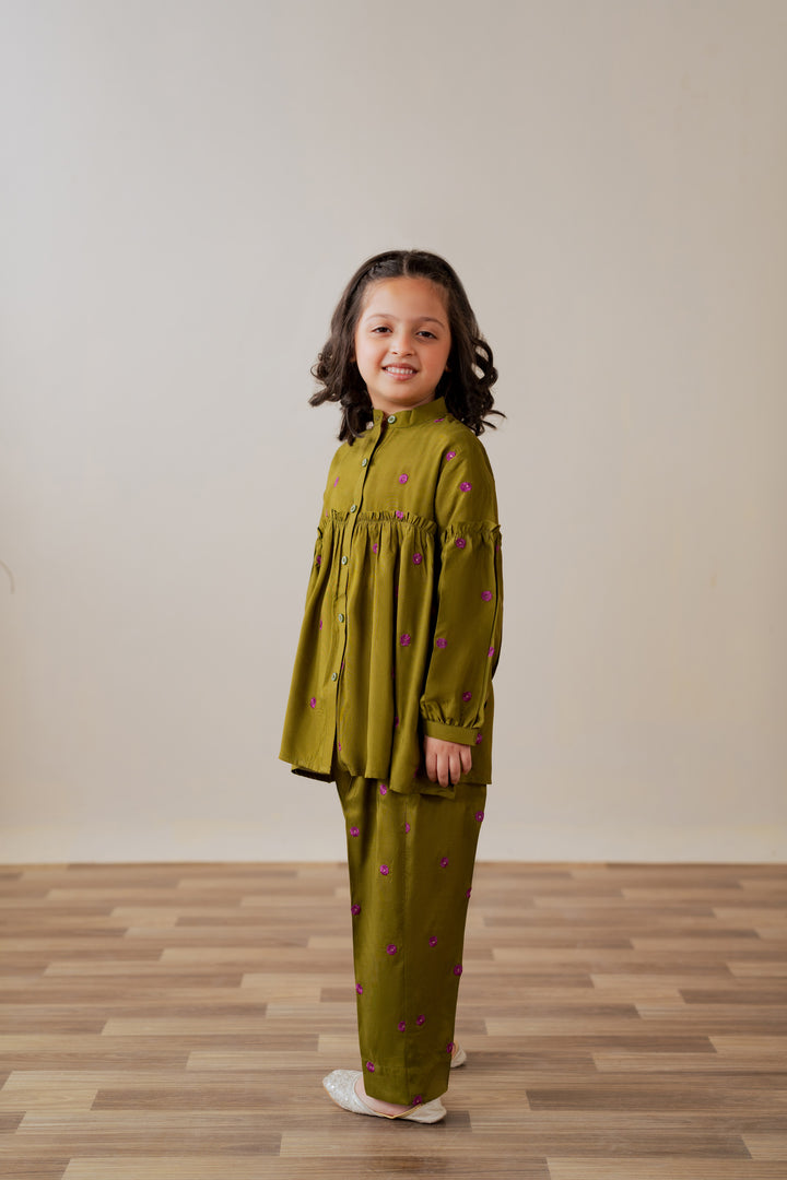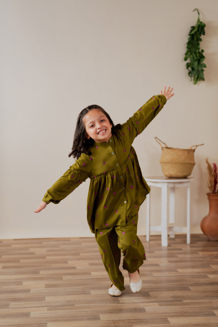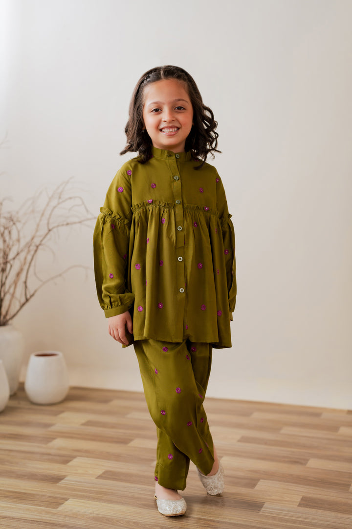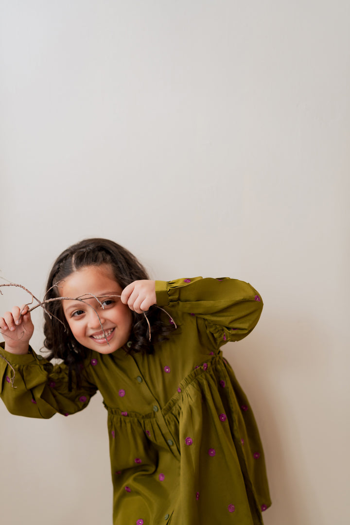 The model is wearing our 7-8 years size. Please refer to the size chart for measurements.