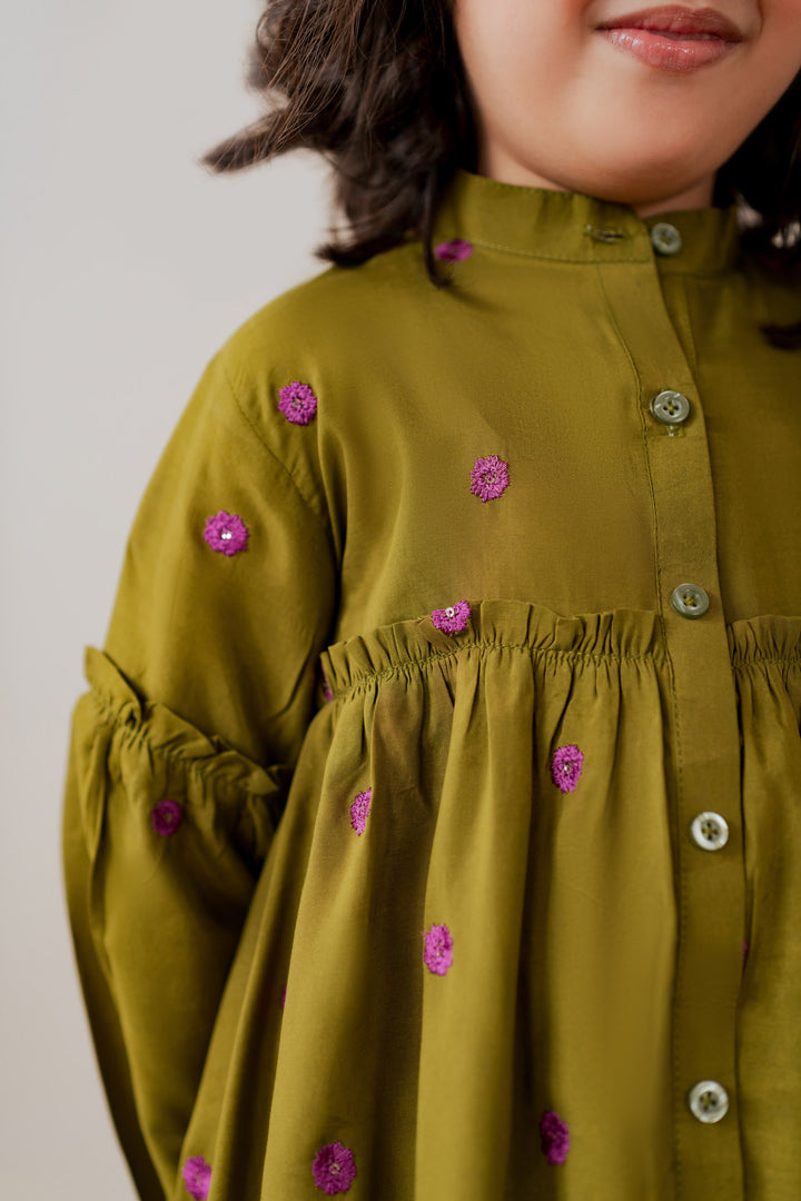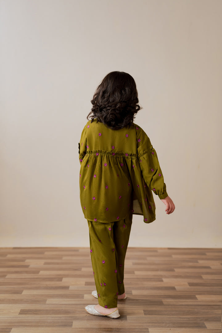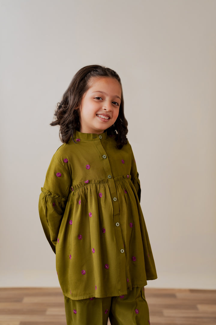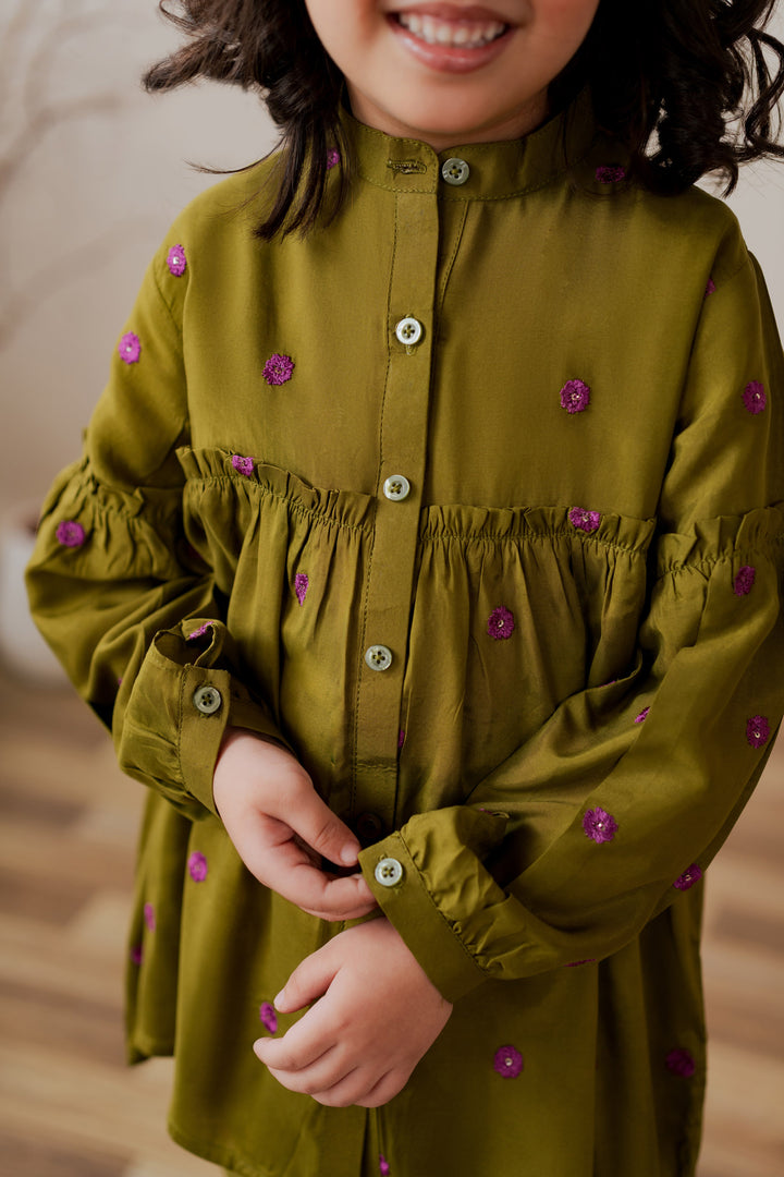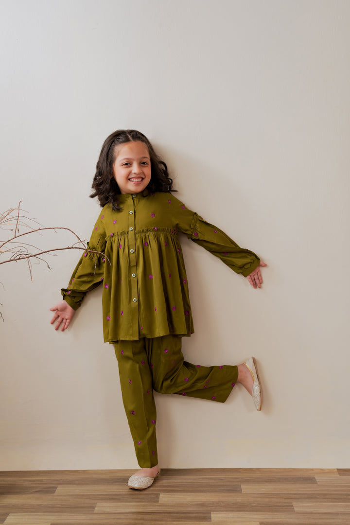 The model is wearing our 7-8 years size. Please refer to the size chart for measurements.