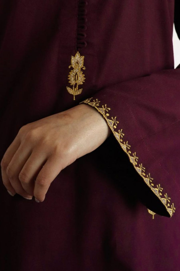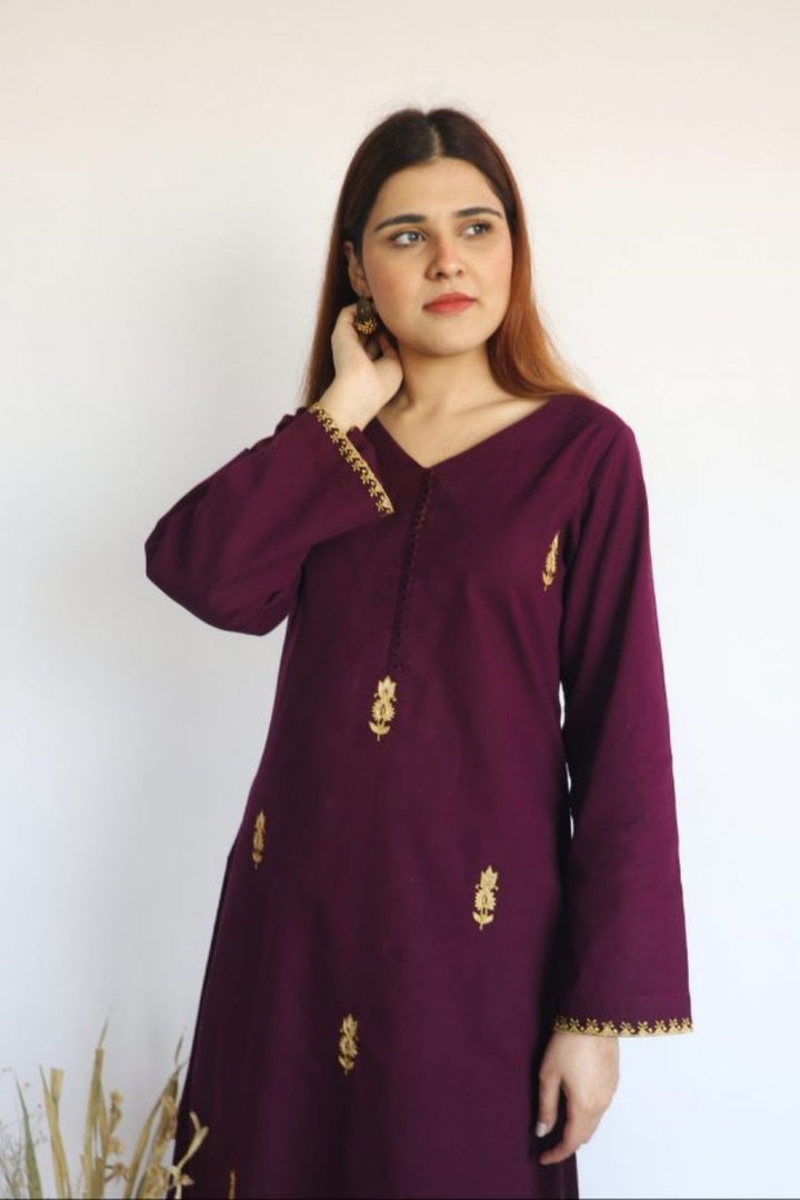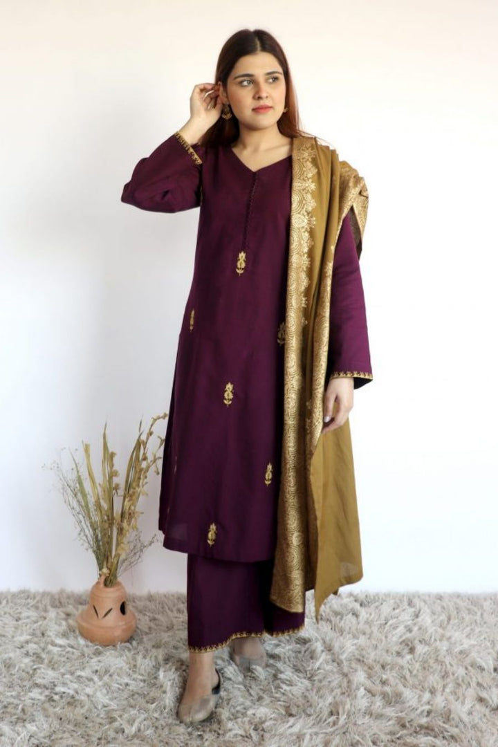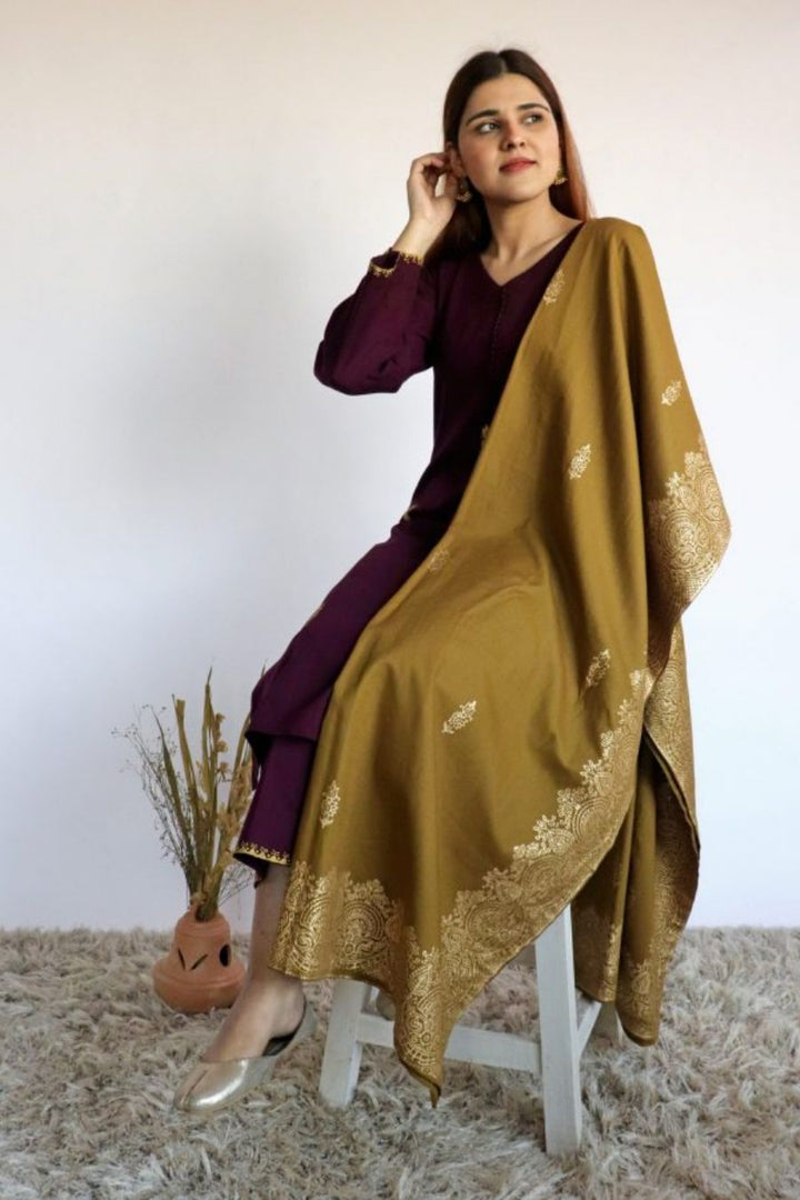 Marina embroidered shirt with a loose fit trouser, hand-block printed shawl.
